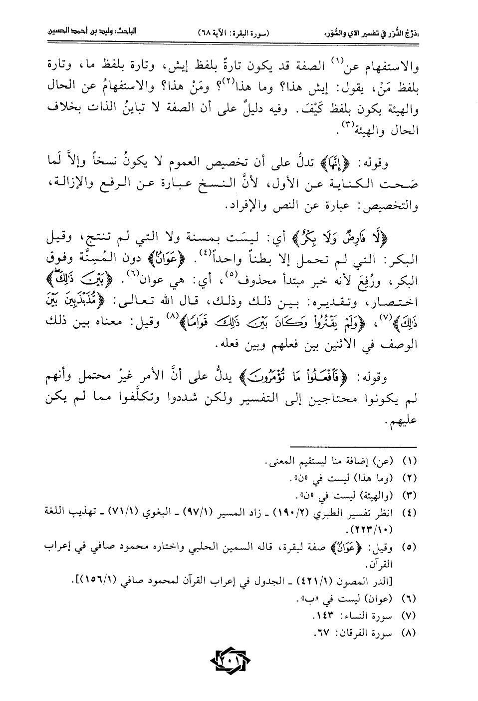 (¬5) وقيل: {عَوَانٌ} صفة لبقرة، قاله السمين الحلبي واختاره محمود صافي في إعراب القرآن.