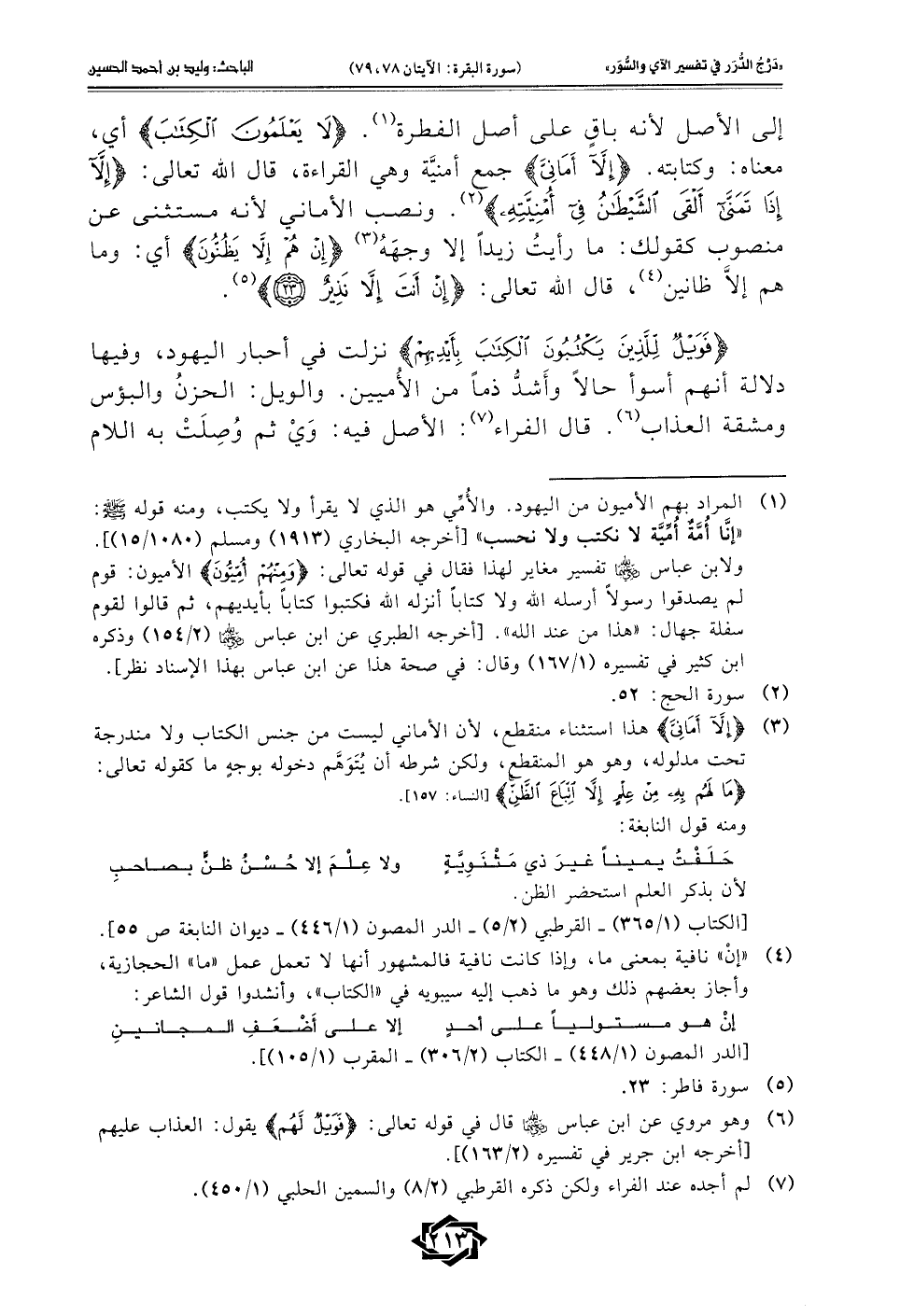إلى الأصل لأنه باقٍ على أصل الفطرة (¬1). {لَا يَعْلَمُونَ الْكِتَابَ} أي، معناه: وكتابته. {إِلَّا أَمَانِيَّ} جمع أمنيَّة وهي القراءة، قال الله تعالى: {إِذَا تَمَنَّى أَلْقَى الشَّيْطَانُ فِي أُمْنِيَّتِهِ} (¬2). ونصب الأماني لأنه مستثنى عن منصوب كقولك: ما رأيتُ زيدًا إلا وجهَهُ (¬3) {إِنْ هُمْ إِلَّا يَظُنُّونَ} أي: وما هم إلَّا ظانين (¬4)، قال الله تعالى: {إِنْ أَنْتَ إِلَّا نَذِيرٌ (23)} (¬5).