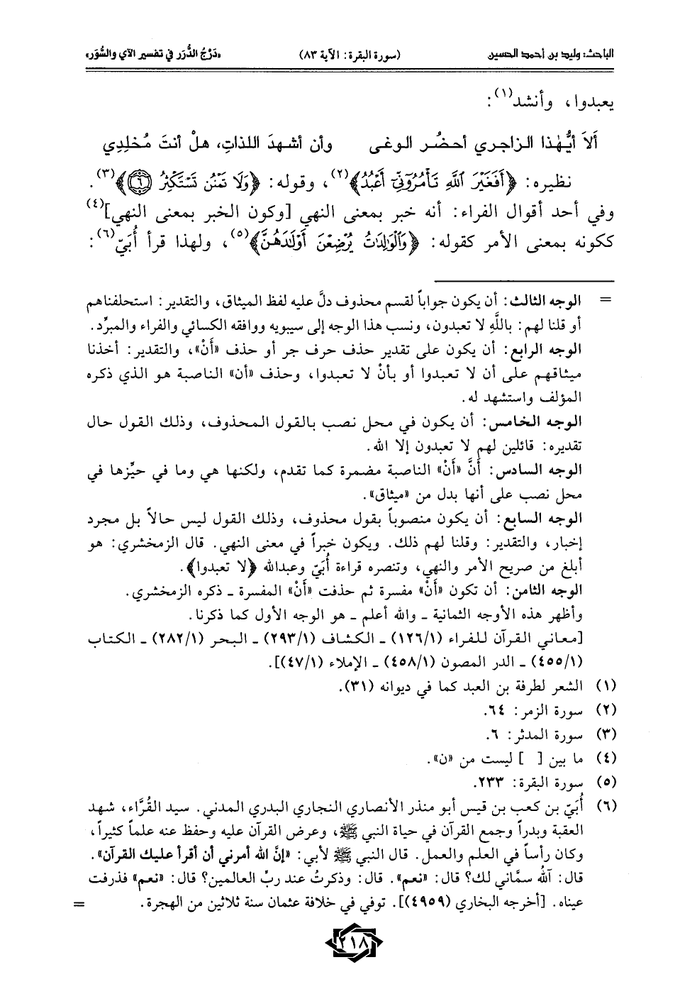 = الوجه الثالث: أن يكون جوابًا لقسم محذوف دلَّ عليه لفظ الميثاق، والتقدير: استحلفناهم أو قلنا لهم: باللهِ لا تعبدون، ونسب هذا الوجه إلى سيبويه ووافقه الكسائي والفراء والمبرِّد.