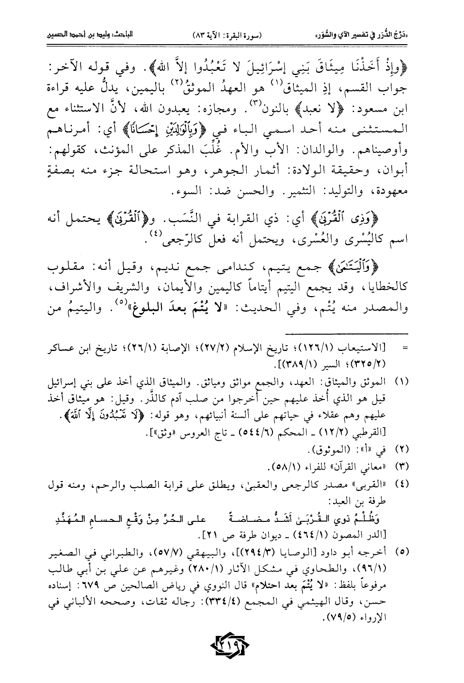 {وَإِذْ أَخَذْنَا مِيثَاقَ بَنِي إِسْرَائِيلَ لَا تَعْبُدُونَ إِلَّا اللَّهَ}. وفي قوله الآخر: جواب القسم، إذِ الميثاق (¬1) هو العهدُ الموثقُ (¬2) باليمين، يدلُّ عليه قراءة ابن مسعود: {لا نعبد} بالنون (¬3). ومجازه: يعبدون الله؛ لأنَّ الاستثناء مع المستثنى منه أحد اسمي الباء في {وَبِالْوَالِدَيْنِ إِحْسَانًا} أي: أمرناهم وأوصيناهم. والوالدان: الأب والأم. غُلِّبَ المذكر على المؤنث، كقولهم: أبوان، وحقيقة الولادة: أثمار الجوهر، وهو استحالة جزء منه بصفةٍ معهودة، والتوليد: التثمير. والحسن ضد: السوء.