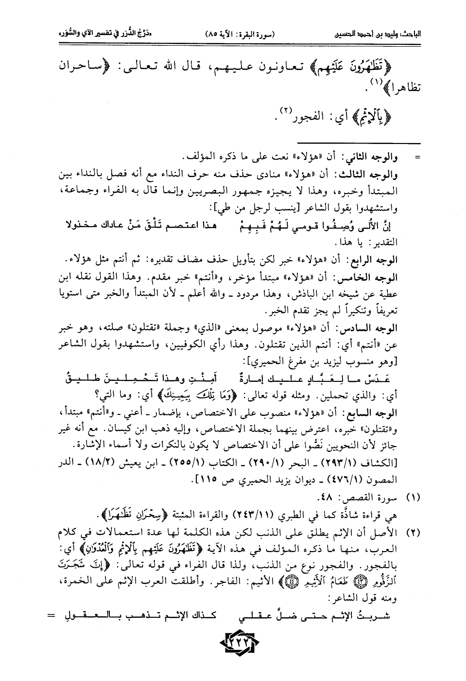 (¬2) الأصل أن الإثم يطلق على الذنب لكن هذه الكلمة لها عدة استعمالات في كلام العرب، منها ما ذكره المؤلف في هذه الآية {تَظَاهَرُونَ عَلَيْهِمْ بِالْإِثْمِ وَالْعُدْوَانِ} أي: بالفجور. والفجور نوع من الذنب، ولذا قال الفراء في قوله تعالى: {إِنَّ شَجَرَتَ الزَّقُّومِ (43) طَعَامُ الْأَثِيمِ (44)} الأثيم: الفاجر. وأطلقت العرب الإثم على الخمرة، ومه قول الشاعر: