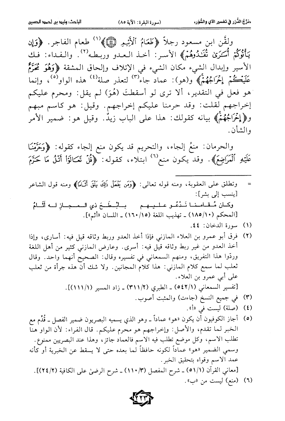 ولقَّن ابن مسعود رجلًا {طَعَامُ الْأَثِيمِ} (¬1) طعام الفاجر. {وَإِنْ يَأْتُوكُمْ أُسَارَى تُفَادُوهُمْ} الأسر: أخذ العدو وربطه (¬2). والفداء: فك الأسير وإبدال الشيء مكان الشيء في الإتلاف وإلحاق المشقة {وَهُوَ مُحَرَّمٌ عَلَيْكُمْ إِخْرَاجُهُمْ} و (هو): عماد جاء (¬3) لتعذر صلة (¬4) هذه الواو (¬5)، وإنما هو فعل في التقدير، ألا ترى لو أسقطتَ (هُوَ) لم يقل: ومحرم عليكم إخراجهم لقلت: وقد حرمنا عليكم إخراجهم. وقيل: هو كاسم مبهم و {إِخْرَاجُهُمْ} بيانه كقولك: هذا على الباب زيدٌ. وقيل هو: ضمير الأمر والشأن.