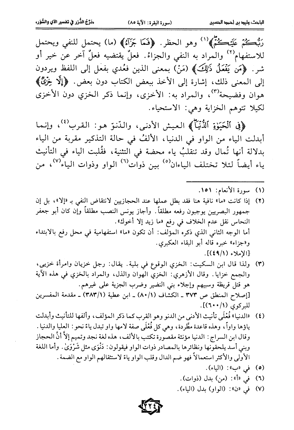 رَبُّكُمْ عَلَيْكُمْ} (¬1) وهو الحظر. {فَمَا جَزَاءُ} (ما) يحتمل للنفي ويحتمل للاستفهام (¬2) والمراد به النفي والجزاءُ. فعلٌ يقتضيه فعلٌ آخر عن خير أو شر. {مَنْ يَفْعَلُ ذَلِكَ} (مَنْ) بمعنى الذين فعُدي بفعل إلى اللفظ ويردون إلى المعنى ذلك، إشارة إلى الأخذ ببعض الكتاب دون بعض. {إِلَّا خِزْيٌ} هوان وفضيحة (¬3)، والمراد به: الأخزى، وإنما ذكر الخزي دون الأخزى لكيلا تتوهم الخزاية وهي: الاستحياء.