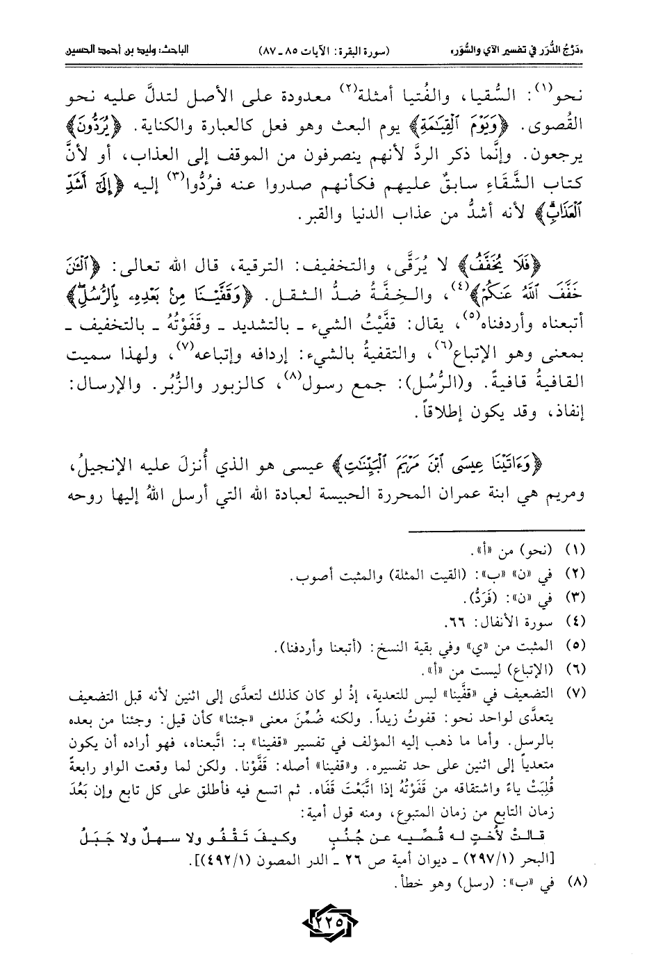 (¬7) التضعيف في "قفَّينا" ليس للتعدية، إذْ لو كان كذلك لتعدَّى إلى اثنين لأنه قبل التضعيف يتعدَّى لواحد نحو: قفوتُ زيدًا. ولكنه ضُمِّنَ معنى "جئنا" كأن قيل: وجئنا من بعده بالرسل. وأما ما ذهب إليه المؤلف في تفسير "قفينا" بـ: اتَّبعناه، فهو أراده أن يكون متعديًا إلى اثنين على حد تفسيره. و"قفينا" أصله: قَفَّوْنا. ولكن لما وقعت الواو رابعةً قُلِبَتْ ياءً واشتقاقه من قَفَوْتُهُ إذا اتَّبَعْتَ قَفَاه. ثم اتسع فيه فأطلق على كل تابع وإن بَعُدَ زمان التابع من زمان المتبوع، ومنه قول أمية: