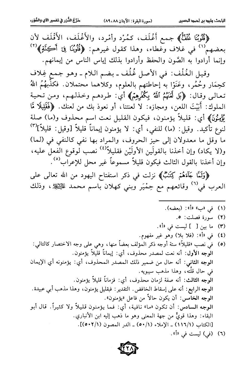 (¬5) في نصب "قليلًا" ستة أوجه ذكر المؤلف بعضًا منها، وهي على وجه الاختصار كالتالي:
