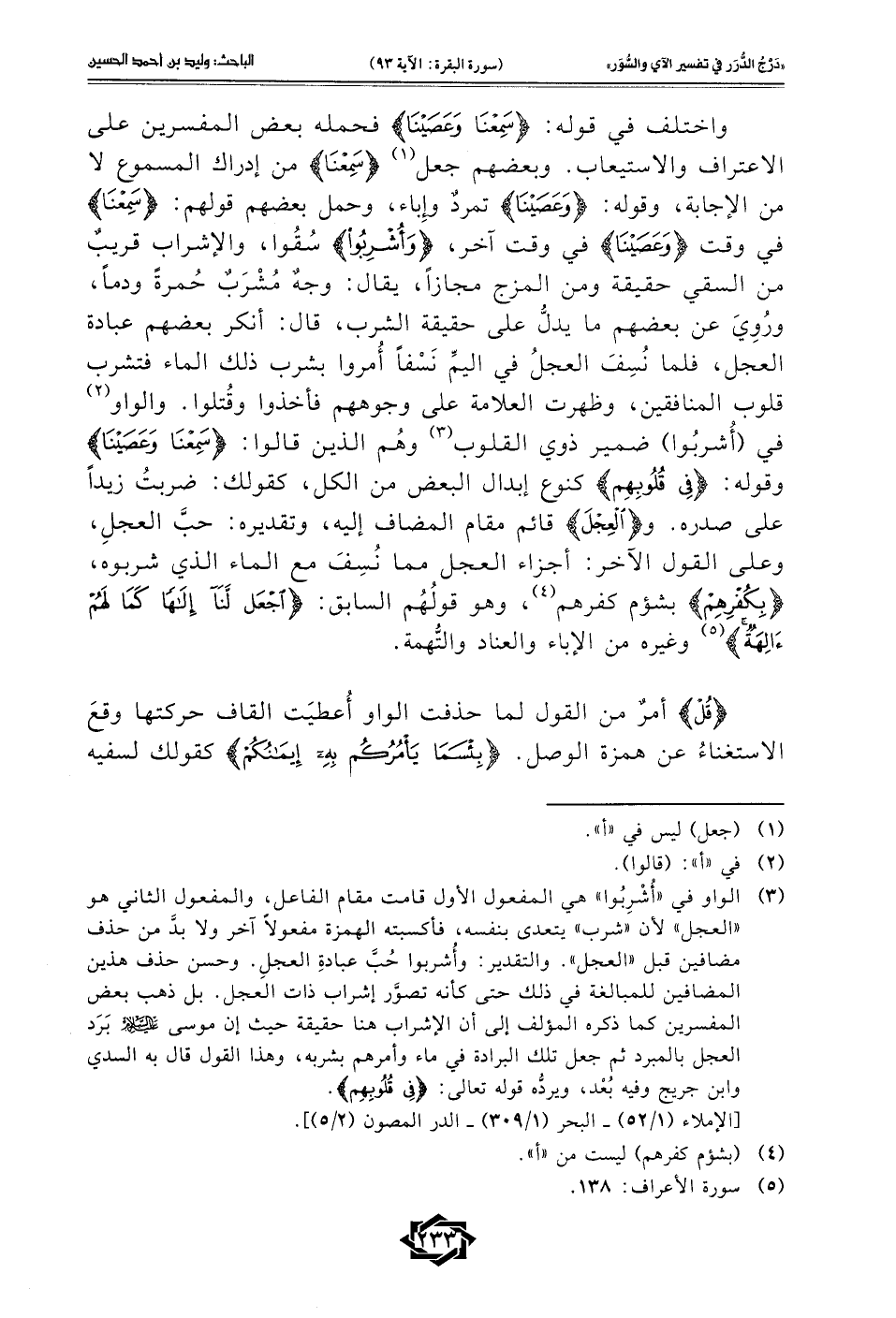 واختلف في قوله: {سَمِعْنَا وَعَصَيْنَا} فحمله بعض المفسرين على الاعتراف والاستيعاب. وبعضهم جعل (¬1) {سَمِعْنَا} من إدراك المسموع لا من الإجابة، وقوله: {وَعَصَيْنَا} تمردٌ وإِباء، وحمل بعضهم قولهم: {سَمِعْنَا} في وقت {وَعَصَيْنَا} في وقت آخر، {وَأُشْرِبُوا} أى سُقُوا، والإشراب قريبٌ من السقي حقيقة ومن المزج مجازًا، يقال: وجهٌ مُشْرَبٌ حُمرةً ودمًا، ورُوِيَ عن بعضهم ما يدلُّ على حقيقة الشرب، قال: أنكر بعضهم عبادة العجل، فلما نُسِفَ العجلُ في اليمِّ نَسْفًا أُمروا بشرب ذلك الماء فتشرب قلوب المنافقين، وظهرت العلامة على وجوههم فأخذوا وقُتلوا. والواو (¬2) في (أُشربُوا) ضمير ذوي القلوب (¬3) وهُم الذين قالوا: {سَمِعْنَا وَعَصَيْنَا} وقوله: {فِي قُلُوبِهِمُ} كنوع إبدال البعض من الكل، كقولك: ضربتُ زيدًا على صدره. و {الْعِجْلَ} قائم مقام المضاف إليه، وتقديره: حبَّ العجلِ، وعلى القول الآخر: أجزاء العجل مما نُسِفَ مع الماء الذي شربوه، {بِكُفْرِهِمْ} بشؤم كفرهم (¬4)، وهو قولُهُم السابق {اجْعَلْ لَنَا إِلَهًا كَمَا لَهُمْ آلِهَةٌ} (¬5) وغيره من الإباء والعناد والتُّهمة.