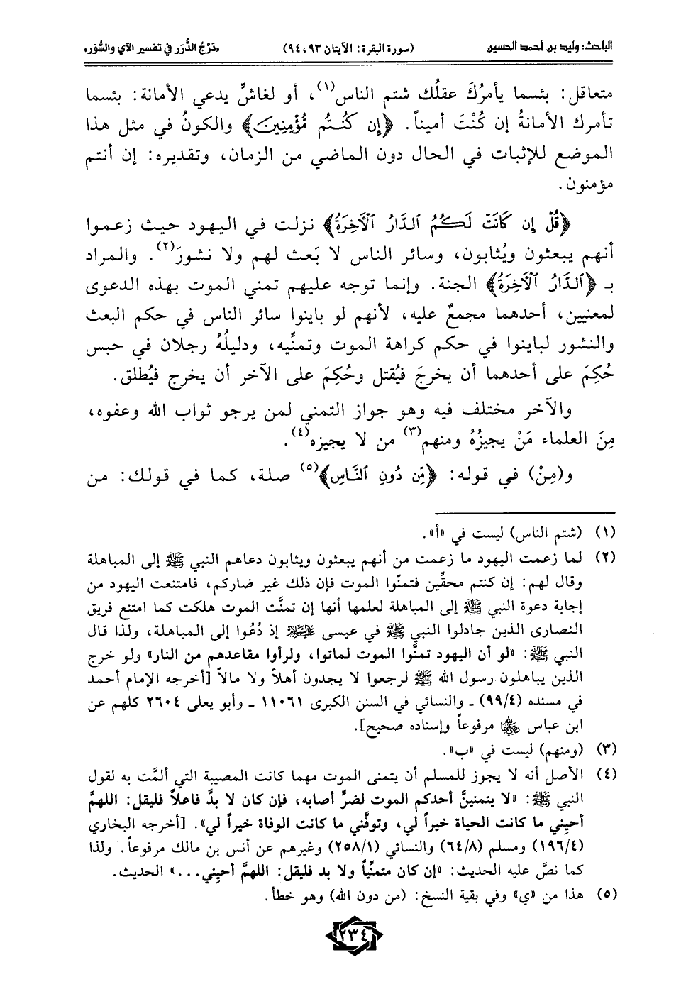 (¬2) لما زعمت اليهود ما زعمت من أنهم يبعثون ويثابون دعاهم النبي - صلى الله عليه وسلم - إلى المباهلة وقال لهم: إن كنتم محقِّين فتمنّوا الموت فإن ذلك غير ضاركم، فامتنعت اليهود من إجابة دعوة النبي - صلى الله عليه وسلم - إلى المباهلة لعلمها أنها إن تمنَّت الموت هلكت كما امتنع فريق النصارى الذين جادلوا النبي - صلى الله عليه وسلم - في عيسى - عليه السلام - إذ دُعُوا إلى المباهلة، ولذا قال النبي - صلى الله عليه وسلم -: "لو أن اليهود تمنَّوا الموت لماتوا, ولرأوا مقاعدهم من النار" ولو خرج الذين يباهلون رسول الله - صلى الله عليه وسلم - لرجعوا لا يجدون أهلًا ولا مالًا [أخرجه الإمام أحمد في مسنده (4/ 99) - والنسائي في السنن الكبرى 11061 - وأبو يعلى 2604 كلهم عن ابن عباس - رضي الله عنهما - مرفوعًا وإسناده صحيح].