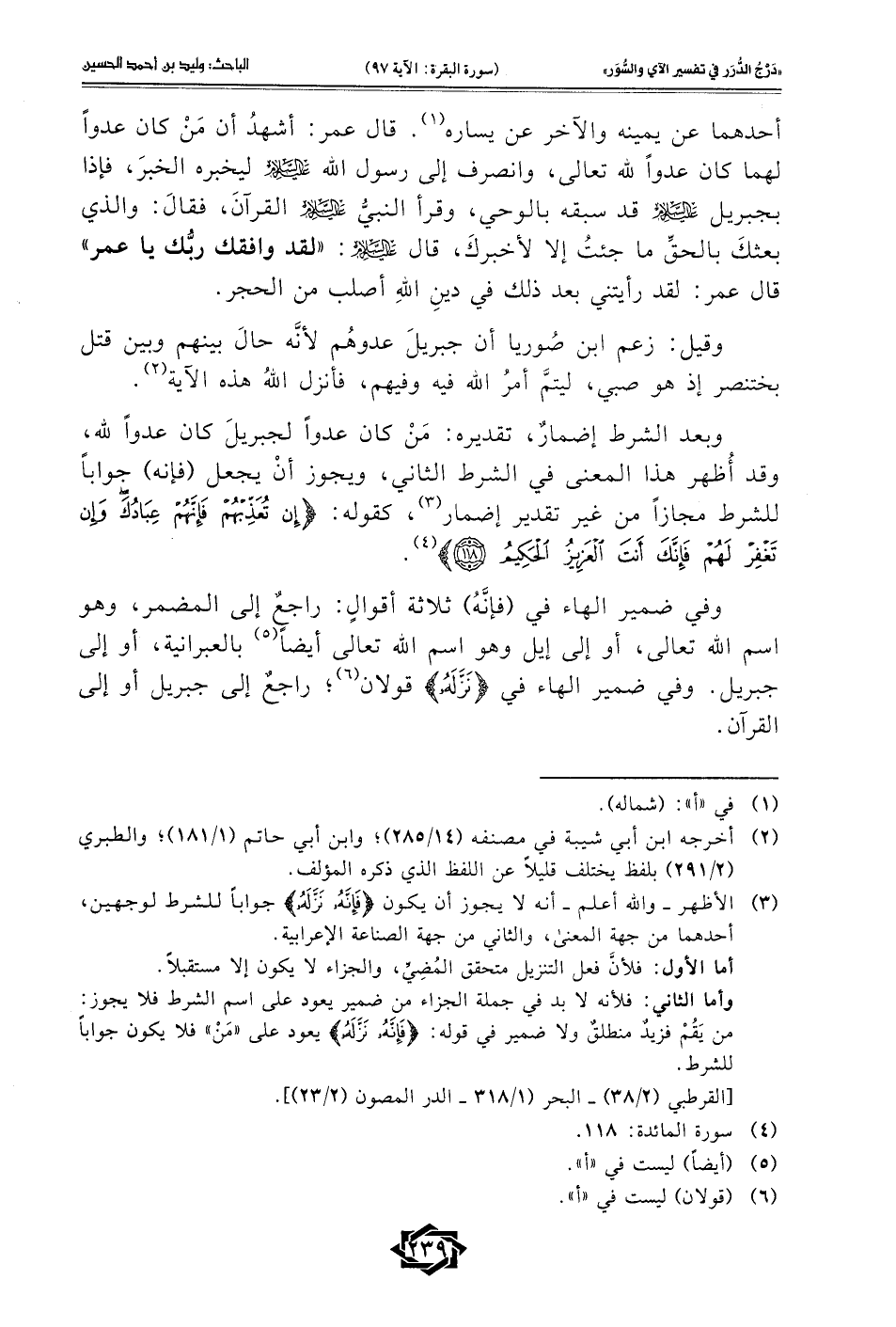 وفي ضمير الهاء في (فإنَهُ) ثلاثة أقوالٍ: راجعٌ إلى المضمر، وهو اسم الله تعالى، أو إلى إيل وهو اسم الله تعالى أيضًا (¬5) بالعبرانية، أو إلى جبريل. وفي ضمير الهاء في {نَزَّلَهُ} قولان (¬6)، راجعٌ إلى جبريل أو إلى القرآن.