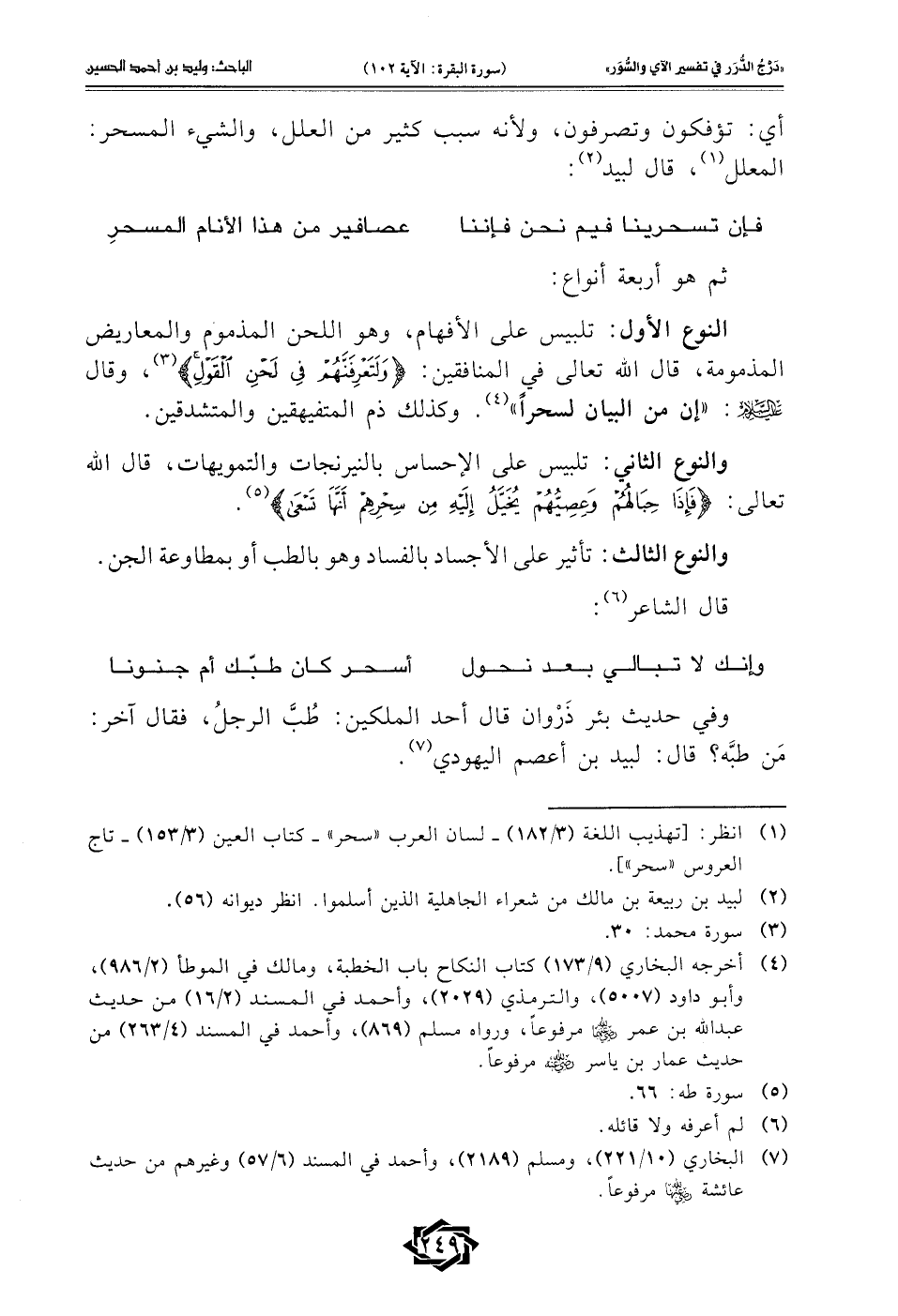 والنوع الثالث: تأثير على الأجساد بالفساد وهو بالطب أو بمطاوعة الجن. قال الشاعر (¬6):