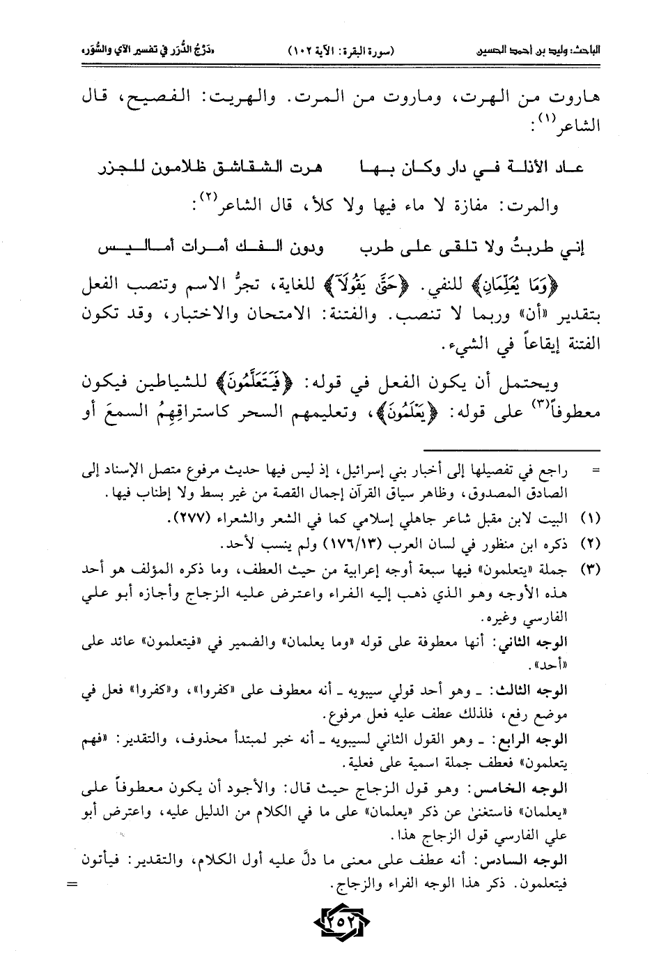 ويحتمل أن يكون الفعل في قوله: {فَيَتَعَلَّمُونَ} للشياطين فيكون معطوفًا (¬3) على قوله: {يُعَلِّمُونَ}، وتعليمهم السحر كاستراقِهِمُ السمعَ أو