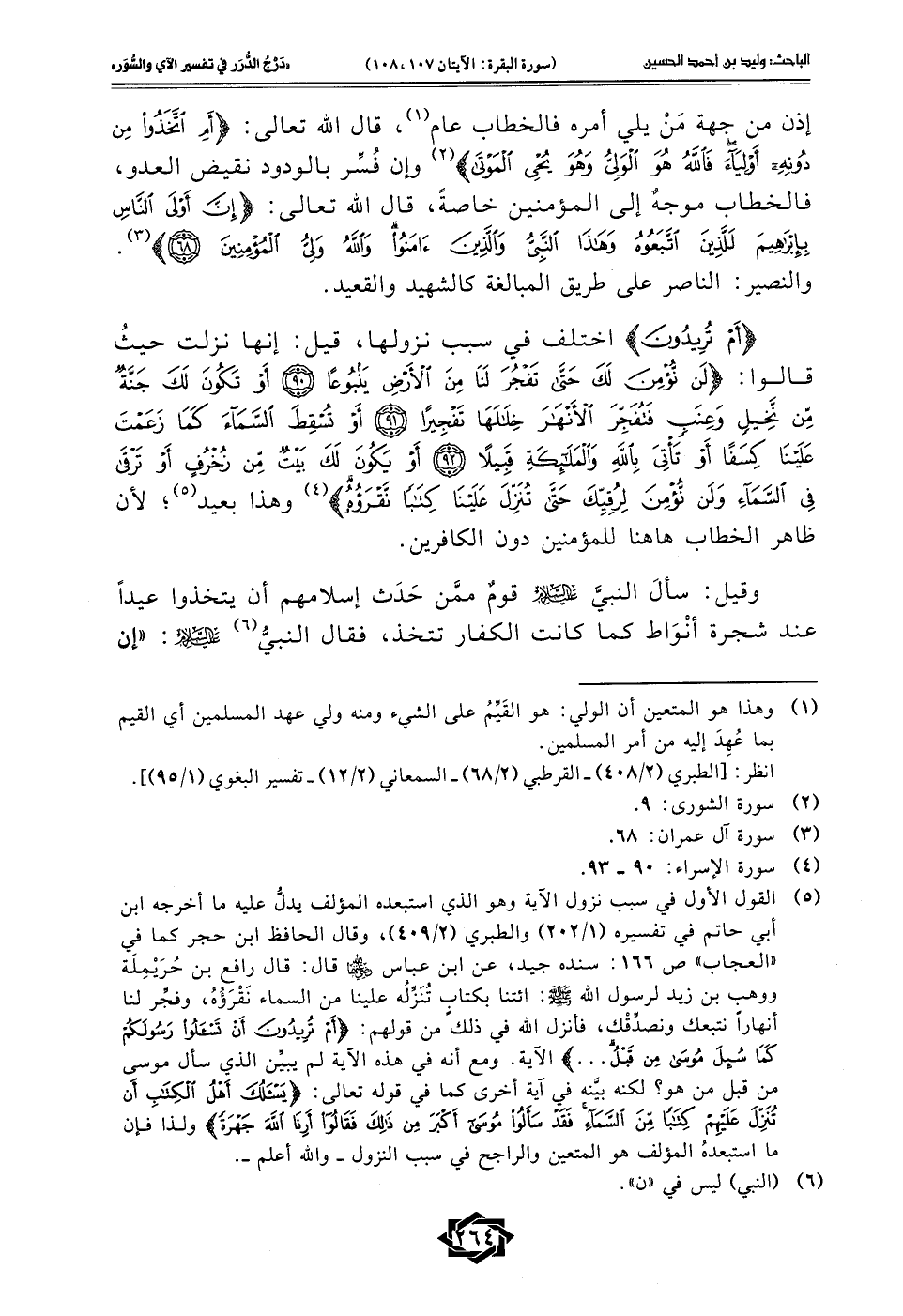 (¬5) القول الأول في سبب نزول الآية وهو الذي استبعده المؤلف يدلُّ عليه ما أخرجه ابن أبي حاتم في تفسيره (1/ 202) والطبري (2/ 409)، وقال الحافظ ابن حجر كما في "العجاب" ص 166: سنده جيد، عن ابن عباس - رضي الله عنهما - قال: قال رافع بن حُرَيْمِلَة ووهب بن زيد لرسول الله - صلى الله عليه وسلم -: ائتنا بكتاب تُنَزِّلُه علينا من السماء نَقْرَؤُهُ، وفجِّر لنا أنهارًا نتبعك ونصدِّقْك، فأنزل الله في ذلكً من قولهم: {أَمْ تُرِيدُونَ أَنْ تَسْأَلُوا رَسُولَكُمْ كَمَا سُئِلَ مُوسَى مِنْ قَبْلُ ...} الآية. ومع أنه في هذه الآية لم يبيِّن الذي سأل موسى مِن قبل من هو؟ لكنه بيَّنه في آية أخرى كما في قوله تعالى: {يَسْأَلُكَ أَهْلُ الْكِتَابِ أَنْ تُنَزِّلَ عَلَيْهِمْ كِتَابًا مِنَ السَّمَاءِ فَقَدْ سَأَلُوا مُوسَى أَكْبَرَ مِنْ ذَلِكَ فَقَالُوا أَرِنَا اللَّهَ جَهْرَةً} ولذا فإن ما استبعدهُ المؤلف هو المتعين والراجح في سبب النزول - والله أعلم -.