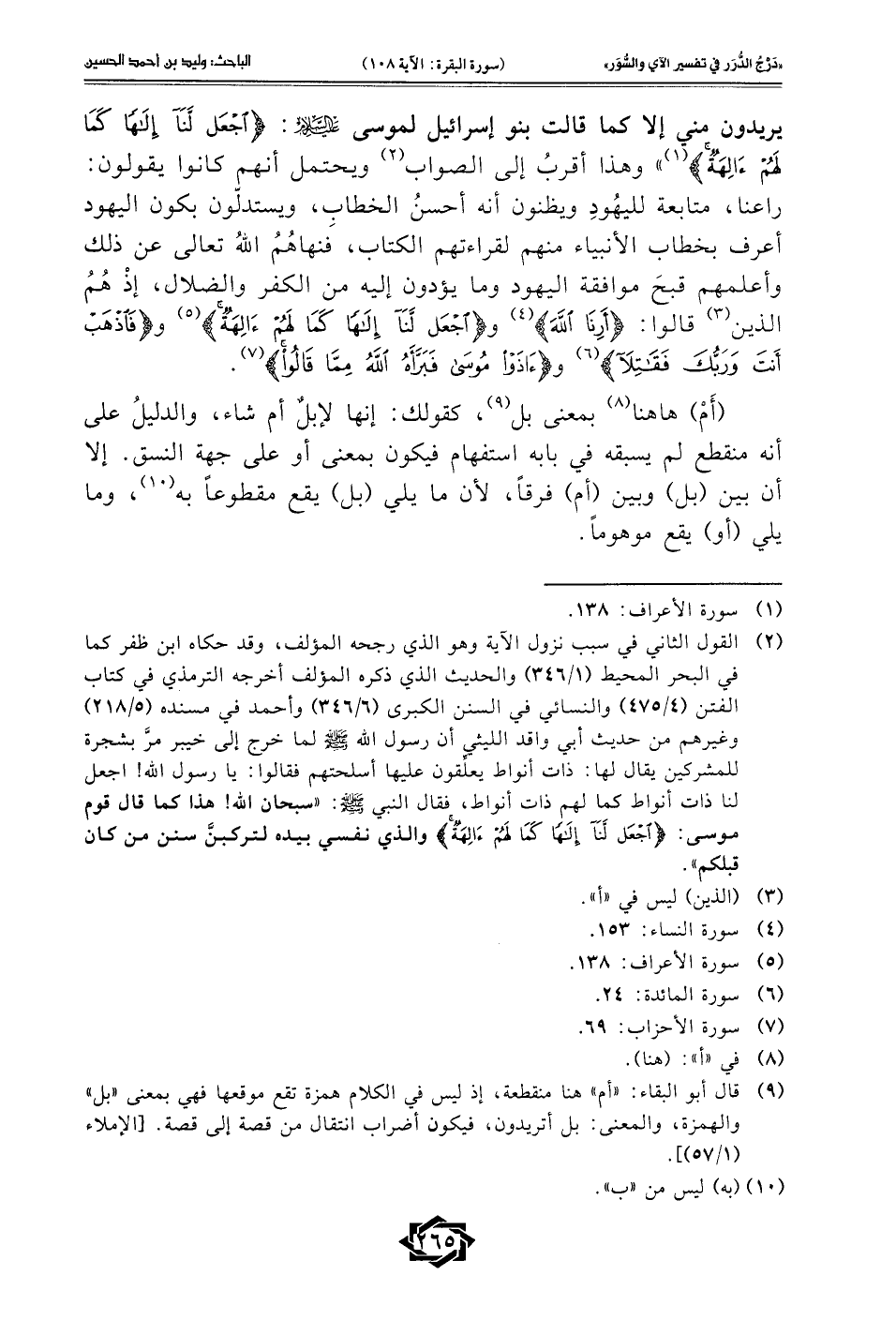 (¬2) القول الثاني في سبب نزول الآية وهو الذي رجحه المؤلف، وقد حكاه ابن ظفر كما في البحر المحيط (1/ 346) والحديث الذي ذكره المؤلف أخرجه الترمذي في كتاب الفتن (4/ 475) والنسائي في السنن الكبرى (6/ 346) وأحمد في مسنده (5/ 218) وغيرهم من حديث أبي واقد الليثي أن رسول الله - صلى الله عليه وسلم - لما خرج إلى خيبر مرَّ بشجرة للمشركين يقال لها: ذات أنواط يعلِّقون عليها أسلحتهم فقالوا: يا رسول الله! اجعل لنا ذات أنواط كما لهم ذات أنواط، فقال النبي - صلى الله عليه وسلم -: "سبحان الله! هذا كما قال قوم موسى: {اجْعَلْ لَنَا إِلَهًا كَمَا لَهُمْ آلِهَةٌ} والذي نفسي بيده لتركبنَّ سنن من كان قبلكم".