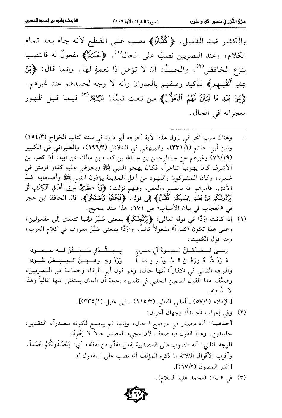 والكثير ضد القليل. {كُفَّارًا} نصب على القطع لأنه جاء بعد تمام الكلام، وعند البصريين نصبٌ على الحال (¬1). {حَسَدًا} مفعولٌ له فانتصب بنزع الخافض (¬2). والحسدُ: أن لا تؤهل ذا نعمةٍ لها. وإنما قال: {مِنْ عِنْدِ أَنْفُسِهِمْ} لتأكيد وصفهم بالعدوان وأنه لا وجه لحسدهم عند غيرهم. {مِنْ بَعْدِ مَا تَبَيَّنَ لَهُمُ الْحَقُّ} من نعتِ نبيِّنا - عليه السلام - (¬3) فيما قبل ظهور معجزاته في الحال.