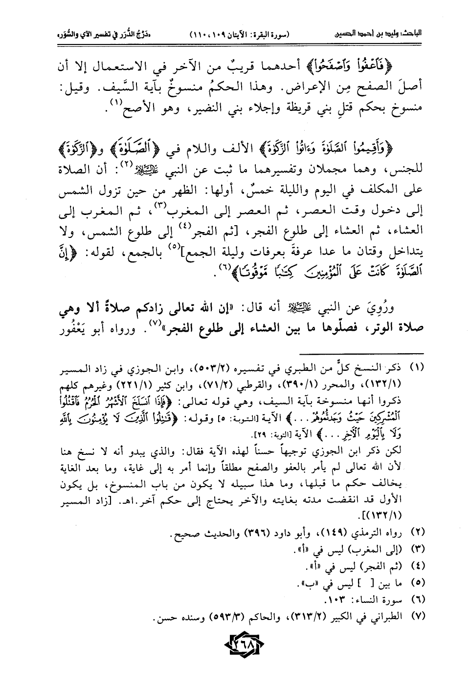 لكن ذكر ابن الجوزي توجيهًا حسنًا لهذه الآية فقال: والذي يبدو أنه لا نسخ هنا لأن الله تعالى لم يأمر بالعفو والصفح مطلقًا وإنما أمر به إلى غاية، وما بعد الغاية يخالف حكم ما قبلها، وما هذا سبيله لا يكون من باب المنسوخ، بل يكون الأول قد انقضت مدته بغايته والآخر يحتاج إلى حكم آخر. اهـ. [زاد المسير (1/ 132)].