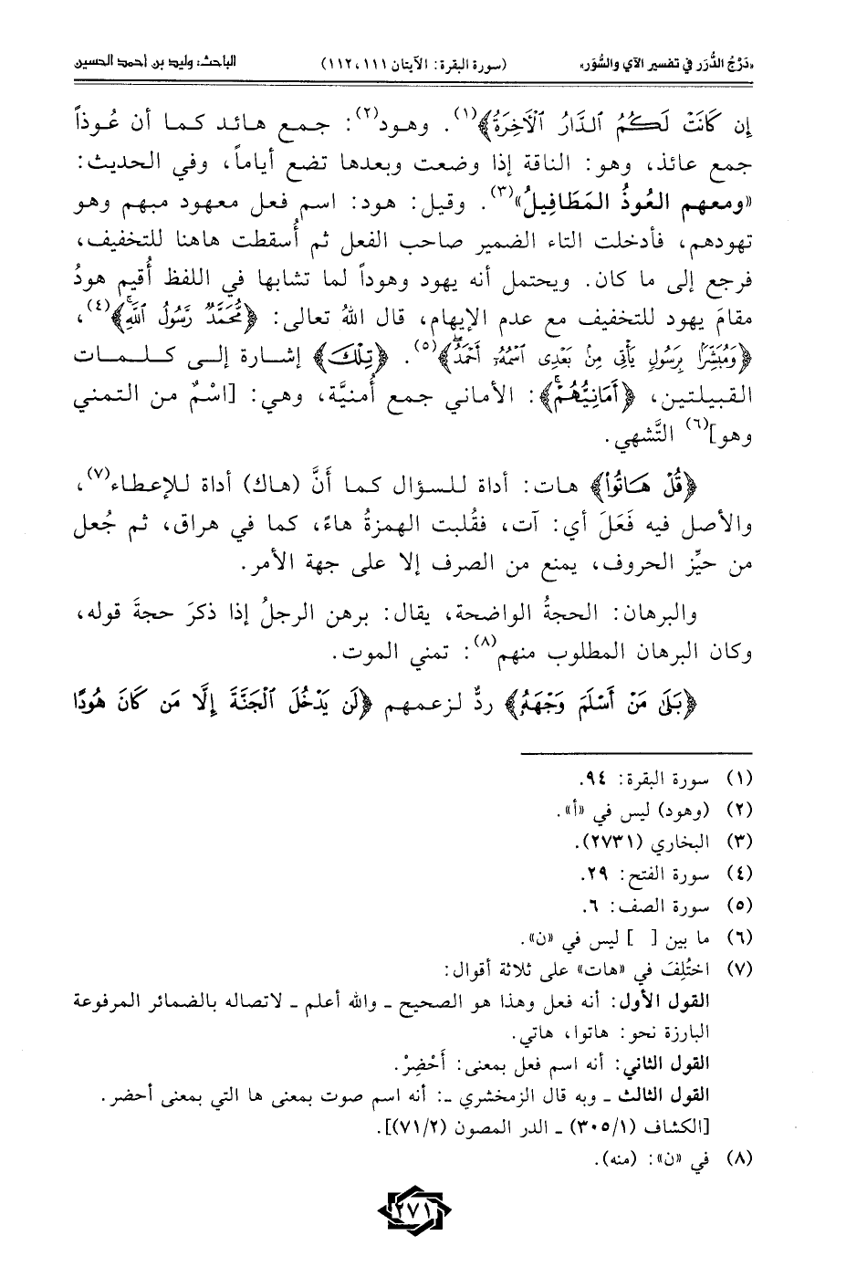 إِنْ كَانَتْ لَكُمُ الدَّارُ الْآخِرَةُ} (¬1). وهود (¬2): جمع هائد كما أن عُوذًا جمع عائذ، وهو: الناقة إذا وضعت وبعدها تضع أيامًا، وفي الحديث: "ومعهم العُوذُ المَطَافِيلُ" (¬3). وقيل: هود: اسم فعل معهود مبهم وهو تهودهم، فأدخلت التاء الضمير صاحب الفعل ثم أُسقطت ها هنا للتخفيف، فرجع إلى ما كان. ويحتمل أنه يهود وهودًا لما تشابها في اللفظ أُقيم هودُ مقامَ يهود للتخفيف مع عدم الإيهام، قال اللهُ تعالى: {مُحَمَّدٌ رَسُولُ اللَّهِ} (¬4)، {وَمُبَشِّرًا بِرَسُولٍ يَأْتِي مِنْ بَعْدِي اسْمُهُ أَحْمَدُ} (¬5). {تِلْكَ} إشارة إلى كلمات القبيلتين، {أَمَانِيُّهُمْ}: الأماني جمع أُمنيَّة، وهي: [اسْمٌ من التمني وهو] (¬6) التَّشهي.
