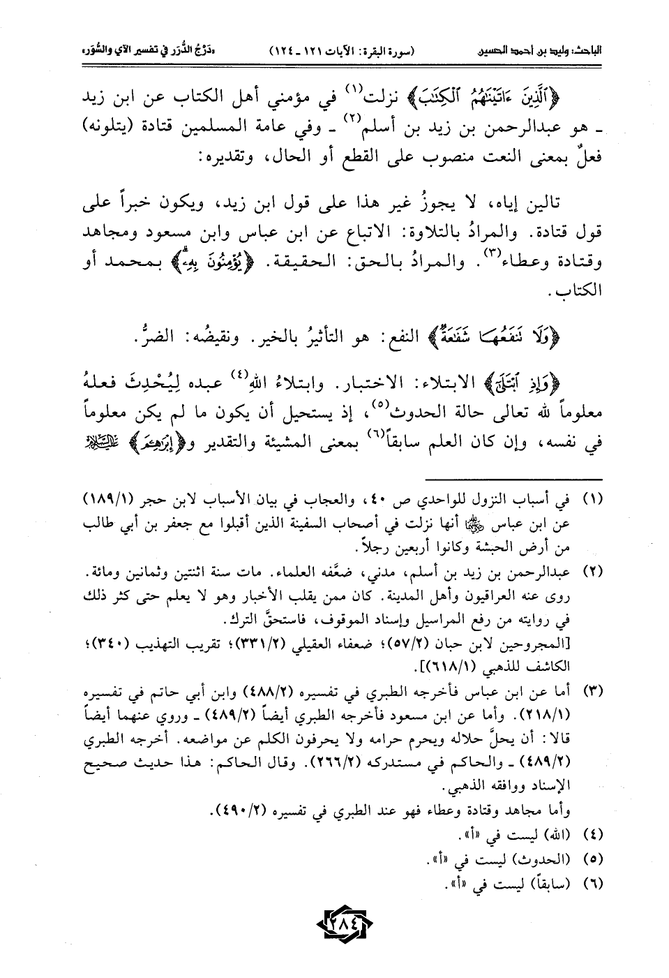 {الَّذِينَ آتَيْنَاهُمُ الْكِتَابَ} نزلت (¬1) في مؤمني أهل الكتاب عن ابن زيد - هو عبد الرحمن بن زيد بن أسلم (¬2) - وفي عامة المسلمين قتادة (يتلونه) فعلٌ بمعنى النعت منصوب على القطع أو الحال، وتقديره: تالين إياه، لا يجوزُ غير هذا على قول ابن زيد، ويكون خبرًا على قول قتادة. والمرادُ بالتلاوة: الاتباع عن ابن عباس وابن مسعود ومجاهد وقتادة وعطاء (¬3). والمرادُ بالحق: الحقيقة. {يُؤْمِنُونَ بِهِ} بمحمد أو الكتاب.