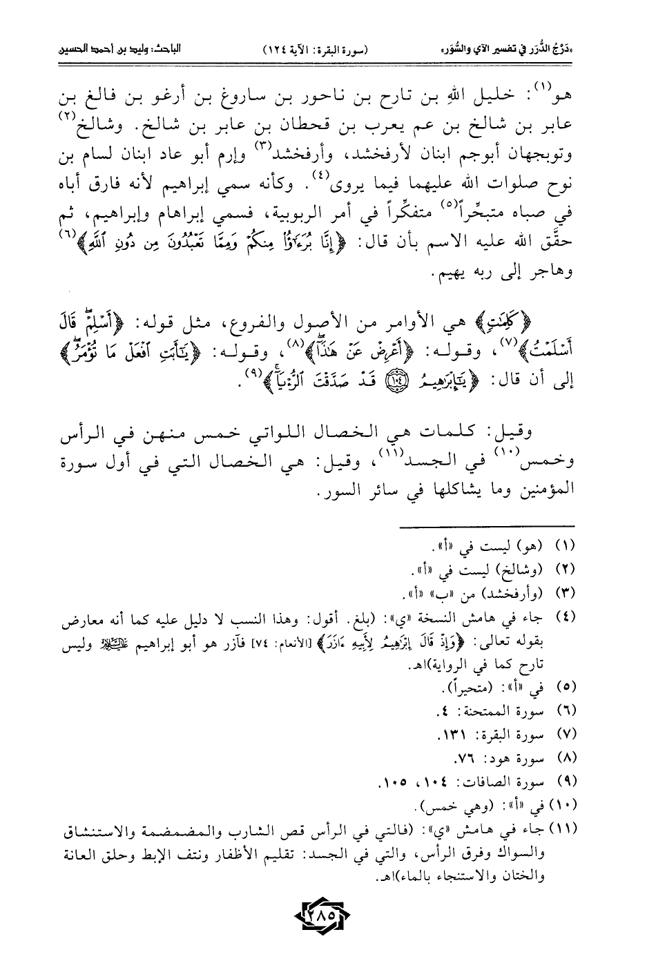 (¬4) جاء في هامش النسخة "ي": (بلغ. أقول: وهذا النسب لا دليل عليه كما أنه معارض بقوله تعالى: {وَإِذْ قَالَ إِبْرَاهِيمُ لِأَبِيهِ آزَرَ} [الأنعام: 74] فآزر هو أبو إبراهيم - عليه السلام - وليس تارح كما في الرواية) اهـ.