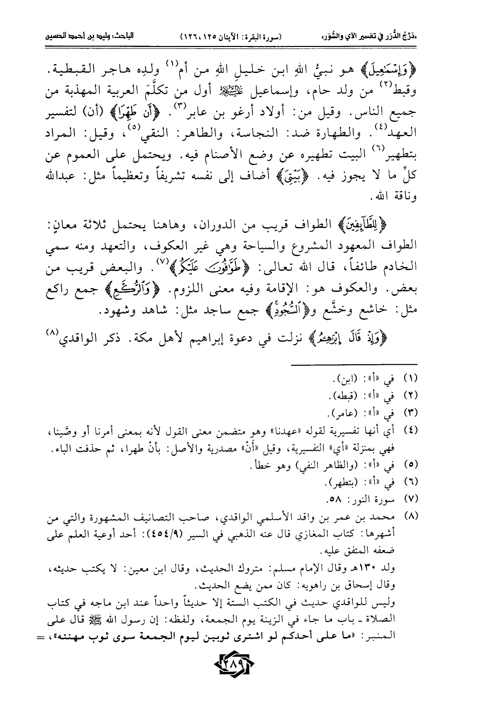 {وَإِسْمَاعِيلَ} هو نبيُّ اللهِ ابن خليلِ اللهِ من أم (¬1) ولدِه هاجر القبطية. وقبط (¬2) من ولد حام، وإسماعيل - عليه السلام - أول من تكلَّمَ العربية المهذبة من جميع الناس. وقيل من: أولاد أرغو بن عابر (¬3). {أَنْ طَهِّرَا} (أن) لتفسير العهد (¬4). والطهارة ضد: النجاسة، والطاهر: النقي (¬5)، وقيل: المراد بتطهير (¬6) البيت تطهيره عن وضع الأصنام فيه. ويحتمل على العموم عن كل ما لا يجوز فيه. {بَيْتِيَ} أضاف إلى نفسه تشريفًا وتعظيمًا مثل: عبد الله وناقة الله.