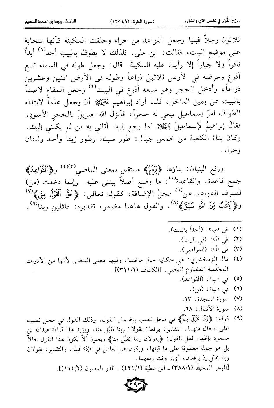 (¬9) قوله: {رَبَّنَا تَقَبَّلْ مِنَّا} في محل نصب بإضمار القول، وذلك القول في محل نصب على الحال منهما. التقدير: يرفعان يقولان ربنا تقبَّل منا، ويؤيد هذا قراءة عبد الله بن مسعود بإظهار فعل القول: هذه الآية غير موجودة بالقرآن {يقولان ربنا تقبَّل منا} ويجوز أَلاَّ يكون هذا القول حالًا بل هو جملة معطوفة على ما قبلها، ويكون هو العامل في "إذ" قبله. والتقدير: يقولان ربنا تقبَّل إذ يرفعان، أي: وقت رفعهما.