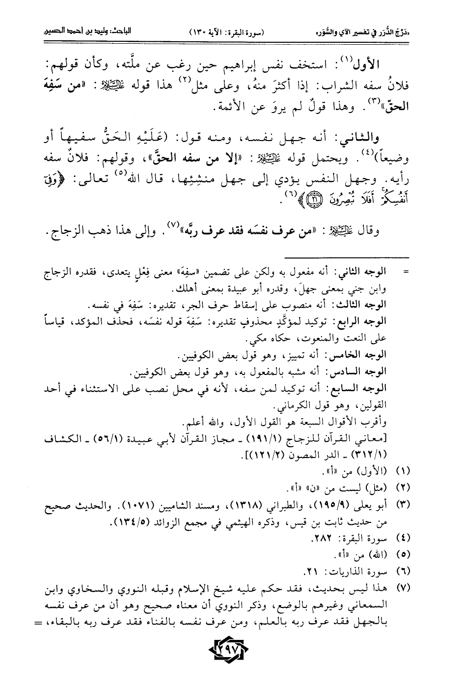 والثاني: أنه جهل نفسه، ومنه قول: (عَلَيْهِ الحَقُّ سفيهًا أو وضيعًا) (¬4). ويحتمل قوله - عليه السلام -: "إلا من سفه الحقَّ"، وقولهم: فلانٌ سفه رأيه. وجهل النفس يؤدي إلى جهل منشِئِها، قال الله (¬5) تعالى: {وَفِي أَنْفُسِكُمْ أَفَلَا تُبْصِرُونَ (21)} (¬6).