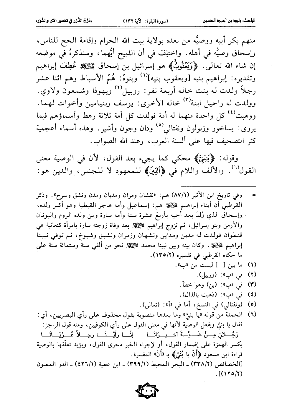 منهم بكر أبيه ووصيُّه من بعده بولاية بيت الله الحرام وإقامة الحج للناس، وإسحاق وصيُّه في أهله. واختلِفَ في أن الذبيح أيُّهما، وسنذكرهُ في موضعه إن شاء الله تعالى. {وَيَعْقُوبُ} هو إسرائيل بن إسحاق - عليه السلام - عُطِفَ إبراهيم وتقديره: إبراهيم بنيه [ويعقوب بنيه] (¬1) وبنوهُ: هُمُ الأسباط وهم اثنا عشر رجلًا ولدت له بنت خاله أربعة نفر: روبيل (¬2) ويهوذا وشمعون ولاوي. وولدت له راحيل ابنة (¬3) خاله الأخرى: يوسف وبنيامين وأخوات لهما. ووهبت (¬4) كل واحدة منهما له أمة فولدت كل أمة ثلاثة رهط وأسماؤهم فيما يروى: يساخور وزبولون ونفتالي (¬5) ودان وجون وأشير. وهذه أسماء أعجمية كثر التصحيف فيها على ألسنة العرب، وعند الله الصواب.