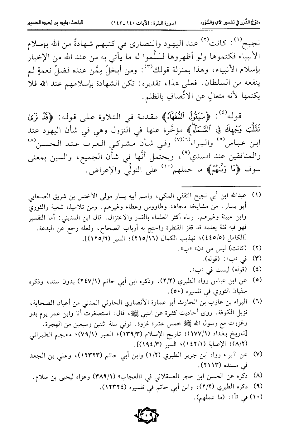 قوله (¬4): {سَيَقُولُ السُّفَهَاءُ} مقدمة في التلاوة على قوله: {قَدْ نَرَى تَقَلُّبَ وَجْهِكَ فِي السَّمَاءِ} مؤخَّرة عنها في النزول وهي في شأن اليهود عند ابن عباس (¬5) والبراء (¬6) (¬7) وفي شأن مشركي العرب عند الحسن (¬8) والمنافقين عند السدي (¬9)، ويحتمل أنَّها في شأن الجميع، والسين بمعنى سوف {مَا وَلَّاهُمْ} ما حملهم (¬10) على التولِّي والإعراض.