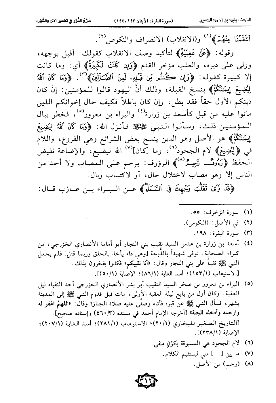 وقوله: {عَلَى عَقِبَيْهِ} لتأكيد وصف الانقلاب كقولك: أقبل بوجهه، وولى على دبره، والعقب مؤخر القدم {وَإِنْ كَانَتْ لَكَبِيرَةً} أي: وما كانت إلا كبيرة كقوله: {وَإِنْ كُنْتُمْ مِنْ قَبْلِهِ لَمِنَ الضَّالِّينَ} (¬3). {وَمَا كَانَ اللَّهُ لِيُضِيعَ إِيمَانَكُمْ} بنسخ القبلة، وذلك أنَّ اليهود قالوا للمؤمنين: إنْ كان دينكم الأول حقًا فقد بطل، وإن كان باطلًا فكيف حال إخوانكم الذين ماتوا عليه من قبل كأسعد بن زرارة (¬4) والبراء بن معرور (¬5)، فخطر ببال المؤمنين ذلك، وسألوا النبي - صلى الله عليه وسلم - فأنزل الله: {وَمَا كَانَ اللَّهُ لِيُضِيعَ إِيمَانَكُمْ} هو الأصل وهو الدين ينسخ بعض الشرائع وهي الفروع، واللام في {لِيُضِيعَ} لام الجحود (¬6)، وما [كان] (¬7) الله ليضيع، والإضاعة نقيض الحفظ {رَءُوفٌ رَحِيمٌ} (¬8) الرؤوف: يرحم على المصاب ولا أحد من الناس إلا وهو مصاب لاختلال حال، أو لاكتساب وبال.