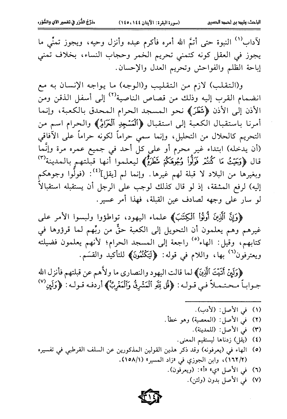 و (التقلب) لازم من التقليب و (الوجه) ما يواجه الإنسان به مع انضمام القرب إليه وذلك من قصاص الناصية (¬2) إلى أسفل الذقن ومن الأذن إلى الأذن {شَطْرَ} نحو المسجد الحرام المحدق بالكعبة، وإنما أمرنا باستقبال الكعبة إلى استقبال {الْمَسْجِدِ الْحَرَامِ} والحرام اسم من التحريم كالحلال من التحليل، وإنما سمي حرامًا لكونه حرامًا على الاَفاقي (أن يدخله) ابتداء غير محرم أو علي كل أحد في جميع عمره مرة وإنَّما قال {وَحَيْثُ مَا كُنْتُمْ فَوَلُّوا وُجُوهَكُمْ شَطْرَهُ} ليعلموا أنها قبلتهم بالمدينة (¬3) وبغيرها من البلاد لا قبلة لهم غيرها. وإنما لم يقل، (¬4): (فولُّوا وجوهكمٍ إليه) لرفع المشقة، إذ لو قال كذلك لوجب على الرجل أن يستقبله استقبالًا لو سار على وجهه لصادف عين القبلة، فهذا أمر عسير.