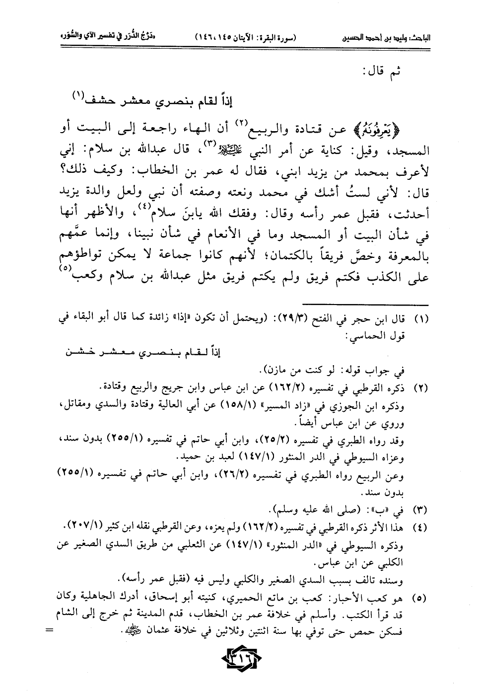 {يَعْرِفُونَهُ} عن قتادة والربيع (¬2) أن الهاء راجعة إلى البيت أو المسجد، وقيل: كناية عن أمر النبي - صلى الله عليه وسلم - (¬3)، قال عبد الله بن سلام: إني لأعرف بمحمد من يزيد ابني، فقال له عمر بن الخطاب: وكيف ذلك؟ قال: لأني لستُ أشك في محمَّد ونعته وصفته أن نبي ولعل والدة يزيد أحدثت، فقبل عمر رأسه وقال: وفقك الله يابنَ سلام (¬4)، والأظهر أنها في شأن البيت أو المسجد وما في الأنعام في شأن نبينا، وإنما عمَّهم بالمعرفة وخصَّ فريقًا بالكتمان؛ لأنهم كانوا جماعة لا يمكن تواطؤهم على الكذب فكتم فريق ولم يكتم فريق مثل عبد الله بن سلام وكعب (¬5)