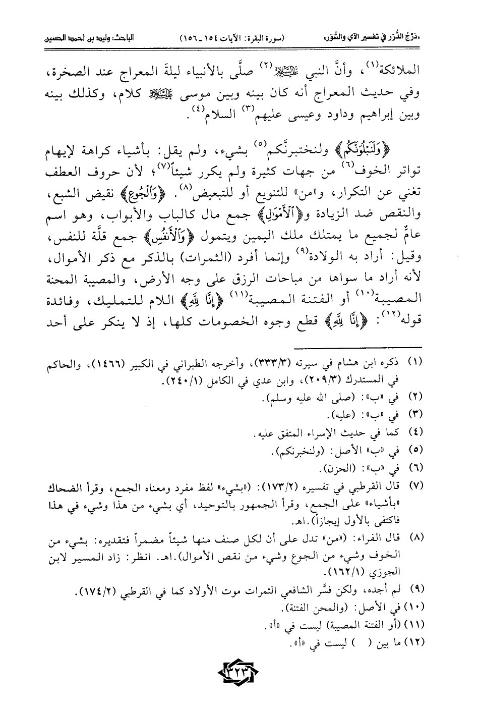 {وَلَنَبْلُوَنَّكُمْ} ولنختبرنَّكم (¬5) بشيء، ولم يقل: بأشياء كراهة لإيهام تواتر الخوف (¬6) من جهات كثيرة ولم يكرر شيئًا (¬7)؛ لأن حروف العطف تغني عن التكرار، و"من" للتنويع أو للتبعيض (¬8). {وَالْجُوعِ} نقيض الشبع، والنقص ضد الزيادة و {الْأَمْوَالِ} جمع مال كالباب والأبواب، وهو اسم عامٌّ لجميع ما يمتلك ملك اليمين ويتمول {وَالْأَنْفُسِ} جمع قلَّة للنفس، وقيل: أراد به الولادة (¬9) وإنما أفرد (الثمرات) بالذكر مع ذكر الأموال، لأنه أراد ما سواها من مباحات الرزق على وجه الأرض، والمصيبة المحنة المصيبة (¬10) أو الفتنة المصيبة (¬11) {إِنَّا لِلَّهِ} اللام للتمليك، وفائدة قوله (¬12): {إِنَّا لِلَّهِ} قطع وجوه الخصومات كلها، إذ لا ينكر على أحد