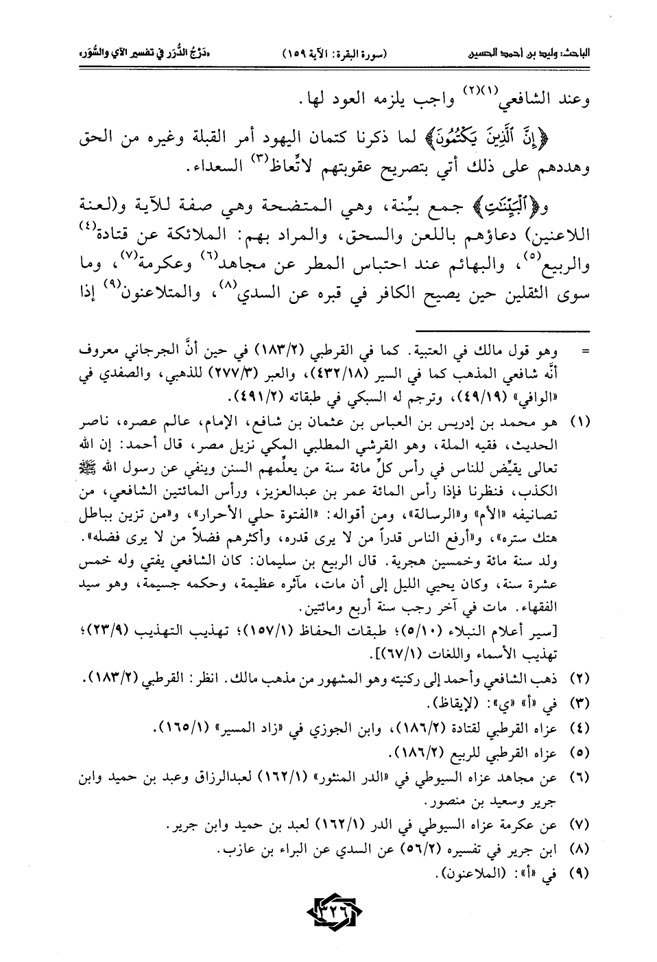 و {الْبَيِّنَاتِ} جمع بيِّنة، وهي المتضحة وهي صفة للآية و (لعنة اللاعنين) دعاؤهم باللعن والسحق، والمراد بهم: الملائكة عن قتادة (¬4) والربيع (¬5)، والبهائم عند احتباس المطر عن مجاهد (¬6) وعكرمة (¬7)، وما سوى الثقلين حين يصيح الكافر في قبره عن السدي (¬8)، والمتلاعنون (¬9) إذا