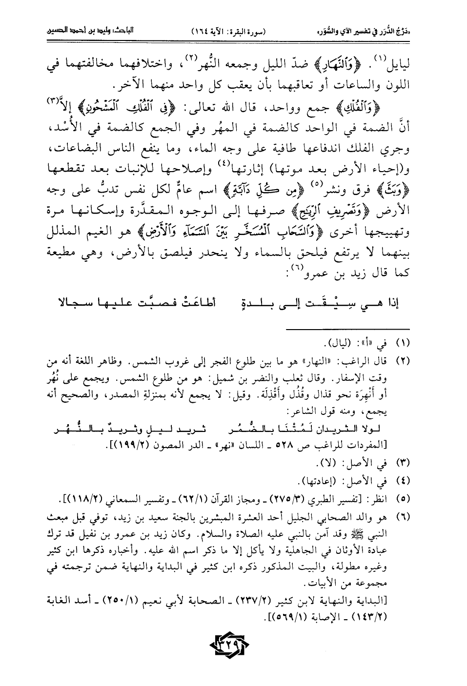 {وَالْفُلْكِ} جمع وواحد، قال الله تعالى: {فِي الْفُلْكِ الْمَشْحُونِ} إلَّا (¬3) أنَّ الضمة في الواحد كالضمة في المهُر وفي الجمع كالضمة في الأُسْد، وجري الفلك اندفاعها طافية على وجه الماء، وما ينفع الناس البضاعات، و (إحياء الأرض بعد موتها) إثارتها (¬4) واصلاحها للإنبات بعد تقطعها {وَبَثَّ} فرق ونشر (¬5) {مِنْ كُلِّ دَابَّةٍ} اسم عام لكل نفس تدبُّ على وجه الأرض {وَتَصْرِيفِ الرِّيَاحِ} صرفها إلى الوجوه المقدَّرة واسكانها مرة وتهييجها أخرى {وَالسَّحَابِ الْمُسَخَّرِ بَيْنَ السَّمَاءِ وَالْأَرْضِ} هو الغيم المذلل بينهما لا يرتفع فيلحق بالسماء ولا ينحدر فيلصق بالأرض، وهي مطيعة كما قال زيد بن عمرو (¬6):