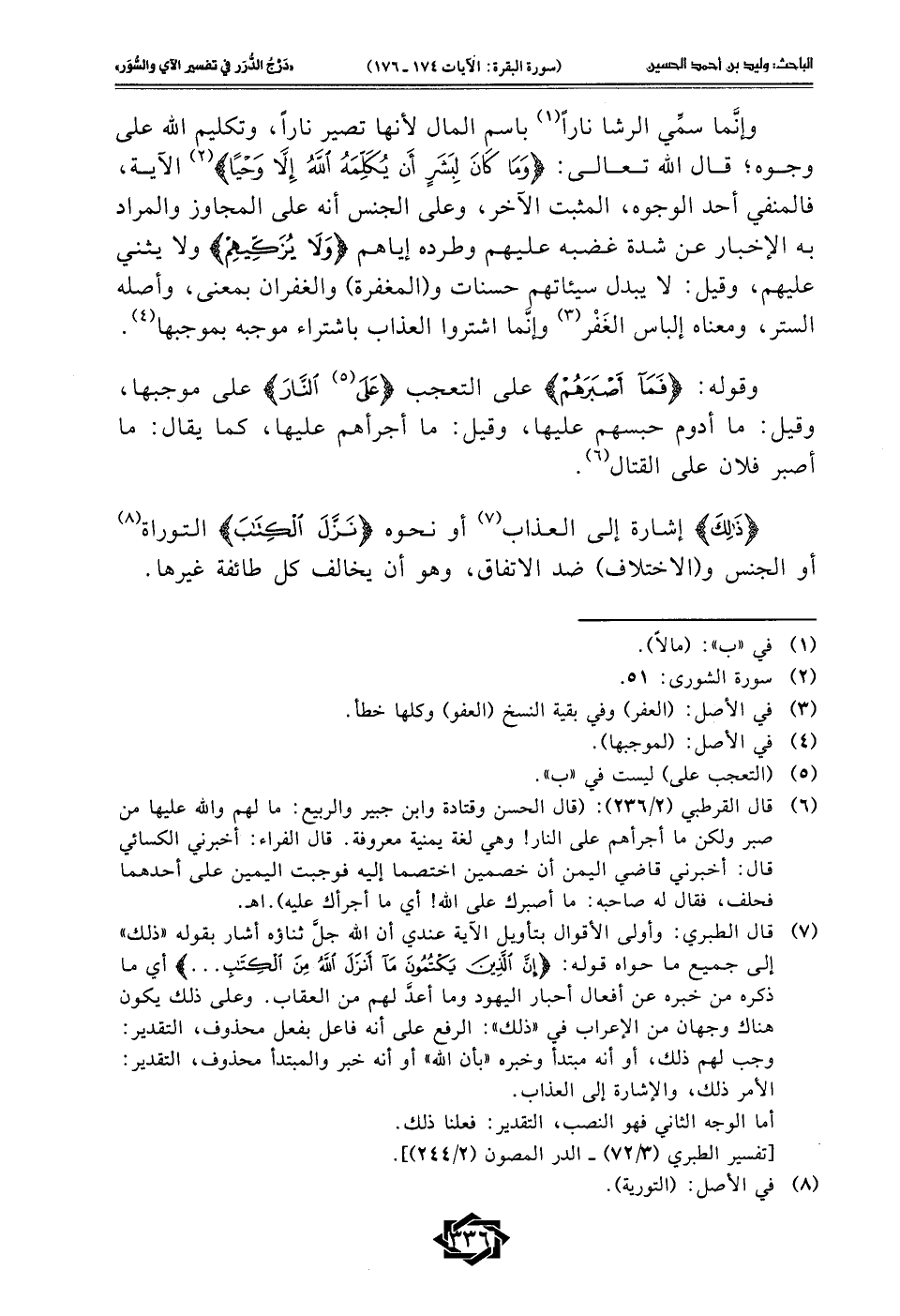 وإنَّما سمِّي الرشا نارًا (¬1) باسم المال لأنها تصير نارًا، وتكليم الله على وجوه؛ قال الله تعالى: {وَمَا كَانَ لِبَشَرٍ أَنْ يُكَلِّمَهُ اللَّهُ إِلَّا وَحْيًا} (¬2) الآية، فالمنفي أحد الوجوه، المثبت الآخر، وعلى الجنس أنه على المجاوز والمراد به الإخبار عن شدة غضبه عليهم وطرده إياهم {وَلَا يُزَكِّيهِمْ} ولا يثني عليهم، وقيل: لا يبدل سيئاتهم حسنات و (المغفرة) والغفران بمعنى، وأصله الستر، ومعناه إلباس الغَفْر (¬3) وإنَّما اشتروا العذاب باشتراء موجبه بموجبها (¬4).