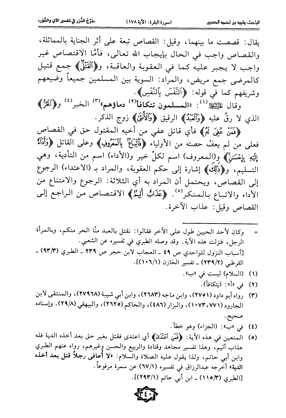 (¬5) المتعين في هذه الآية: {فَمَنِ اعْتَدَى} أي اعتدى فقتل بغير حق بعد أخذه الدية فله عذاب أليم، وهذا تفسير مجاهد وقتادة والربيع والحسن وغيرهم، رواه عنهم الطبري وابن أبي حاتم، ولذا يقول عليه الصلاة والسلام: "لا أُعافى رجلًا قتل بعد أخذه الدية" أخرجه عبد الرزاق في تفسيره (1/ 67) عن سمرة مرفوعًا.