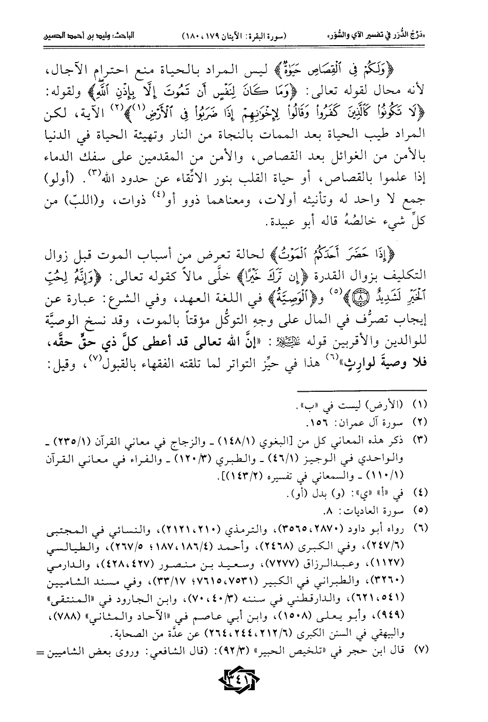 {وَلَكُمْ فِي الْقِصَاصِ حَيَاةٌ} ليس المراد بالحياة منع احترام الآجال، لأنه محال لقوله تعالى: {وَمَا كَانَ لِنَفْسٍ أَنْ تَمُوتَ إِلَّا بِإِذْنِ اللَّهِ} ولقوله: {لَا تَكُونُوا كَالَّذِينَ كَفَرُوا وَقَالُوا لِإِخْوَانِهِمْ إِذَا ضَرَبُوا فِي الْأَرْضِ} (¬1) (¬2) الآية، لكن المراد طيب الحياة بعد الممات بالنجاة من النار وتهيئة الحياة في الدنيا بالأمن من الغوائل بعد القصاص، والأمن من المقدمين على سفك الدماء إذا علموا بالقصاص، أو حياة القلب بنور الاتِّقاء عن حدود الله (¬3). (أولو) جمع لا واحد له وتأنيثه أولات، ومعناهما ذوو أو (¬4) ذوات، و (اللبّ) من كلِّ شيء خالصُهُ قاله أبو عبيدة.