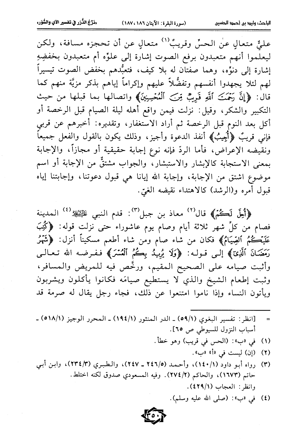 علىِّ متعالٍ عن الحسِّ وقريبٌ (¬1) متعالٍ عن أن تحجزه مسافة، ولكن ليعلموا أنهم متعبدون برفع الصوت إشارة إلى علوِّه أم متعبدون بخفضِهِ إشارة إلى دنوِّه، وهما صفتان له بلا كيف، فتعبُّدهم بخفض الصوت تيسيرًا لهم لئلا يجهدوا أنفسهم وتفضُّلًا عليهم وإكرامًا إياهم بذكر مزيَّة منهم كما قال: {إِنَّ رَحْمَتَ اللَّهِ قَرِيبٌ مِنَ الْمُحْسِنِينَ} واتصالها بما قبلها من حيث التكبير والشكر، وقيل: نزلت فيمن واقع أهله ليلة الصيام قبل الرخصة أو أكل بعد النوم قبل الرخصة ثم أراد الاستغفار، وتقديره: أخبرهم عن قربي فإني قريبٌ {أُجِيبُ} أنفذ الدعوة وأجيز، وذلك يكون بالقول والفعل جميعًا ونقيضه الإعراض، فأما الردّ فإنه نوع إجابة حقيقية أو مجازًا، والإجابة بمعنى الاستجابة كالإبشار والاستبشار، والجواب مشتقٌّ من الإجابة أو اسم موضوع اشتق من الإجابة، واجابة الله إيانا هي قبول دعوتنا، واجابتنا إياه قبول أمره و (الرشد) كالاهتداء نقيضه الغيّ.