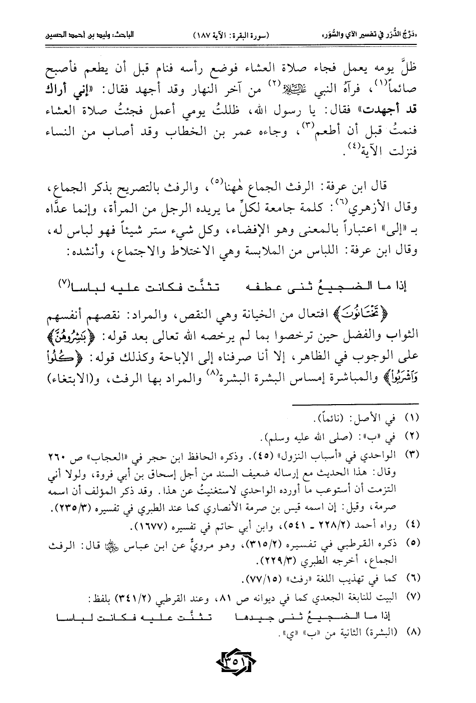(¬5) ذكره القرطبي في تفسيره (2/ 315)، وهو مرويٌّ عن ابن عباس - رضي الله عنهما - قال: الرفث الجماع، أخرجه الطبري (3/ 229).