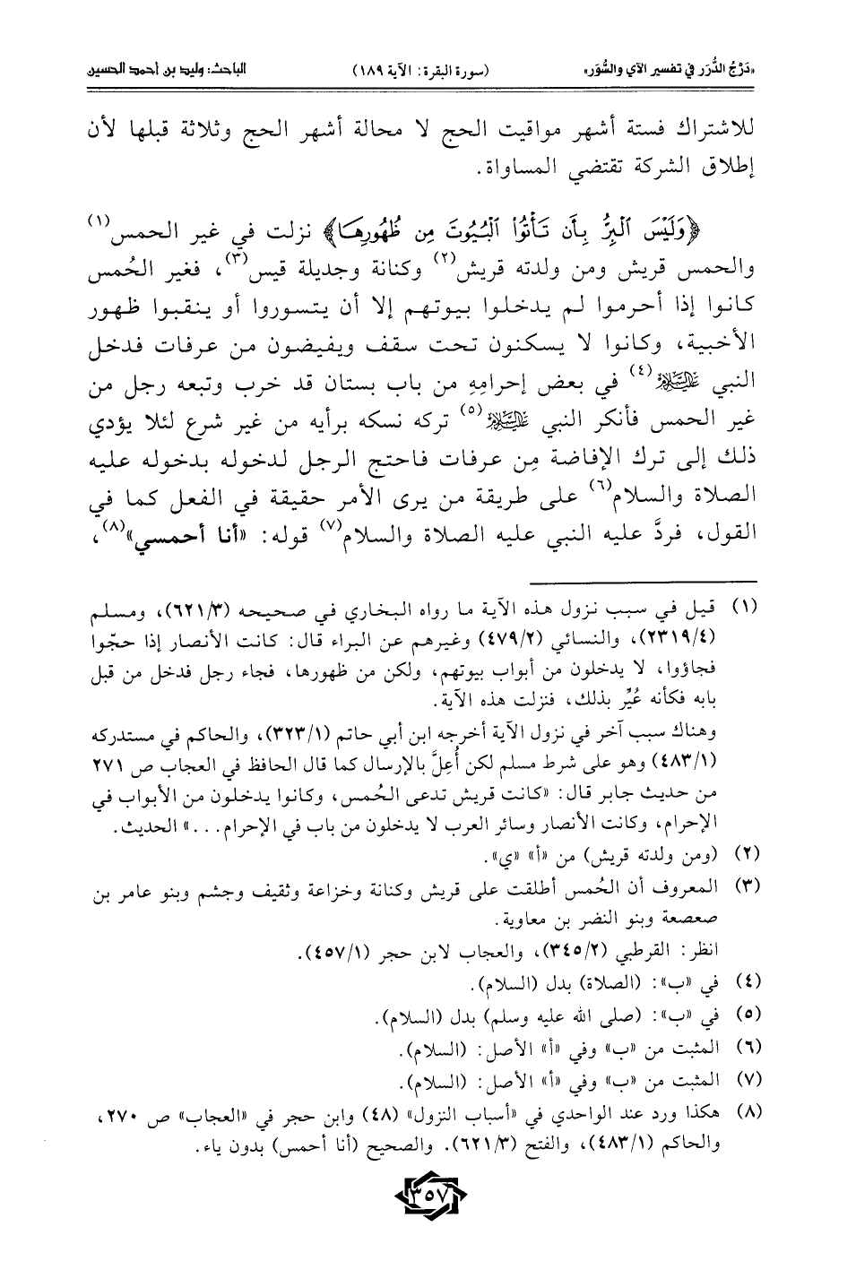وهناك سبب آخر في نزول الآية أخرجه ابن أبي حاتم (1/ 323)، والحاكم في مستدركه (1/ 483) وهو على شرط مسلم لكن أعِلَّ بالإرسال كما قال الحافظ في العجاب ص 271 من حديث جابر قال: "كانت قريش تدعى الحُمس، وكانوا يدخلون من الأبواب في الإحرام، وكانت الأنصار وسائر العرب لا يدخلون من باب في الإحرام ... " الحديث.
