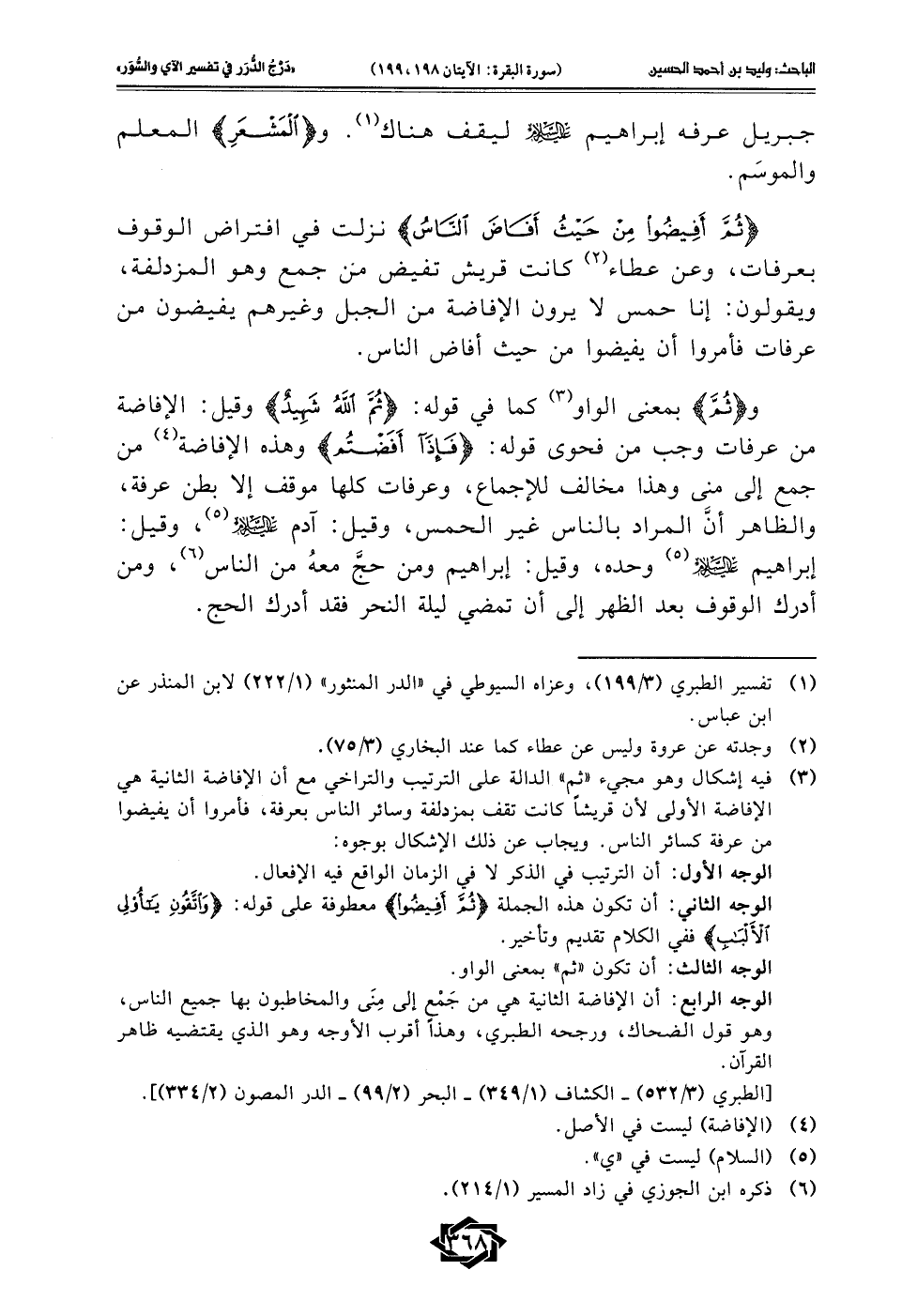 (¬3) فيه إشكال وهو مجيء "ثم" الدالة على الترتيب والتراخي مع أن الإفاضة الثانية هي الإفاضة الأولى لأن قريشًا كانت تقف بمزدلفة وسائر الناس بعرفة، فأمروا أن يفيضوا من عرفة كسائر الناس. ويجاب عن ذلك الإشكال بوجوه:
