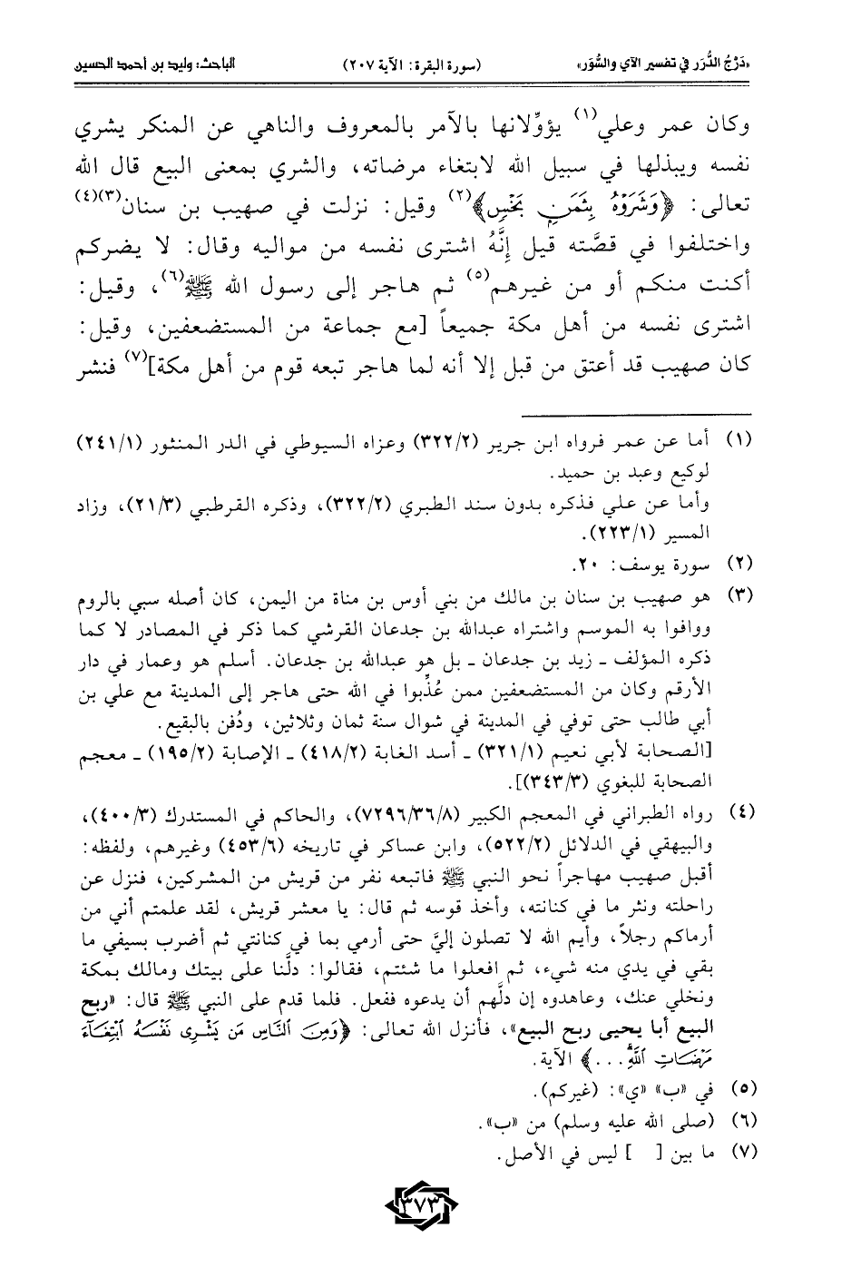(¬4) رواه الطبراني في المعجم الكبير (8/ 36/7296)، والحاكم في المسندرك (3/ 400)، والبيهقي في الدلائل (2/ 522)، وابن عساكر في تاريخه (6/ 453) وغيرهم، ولفظه: أقبل صهيب مهاجرًا نحو النبي - صلى الله عليه وسلم - فأتبعه نفر من قريش من المشركين، فنزل عن راحلته ونثر ما في كنانته، وأخذ قوسه ثم قال: يا معشر قريش، لقد علمتم أني من أرماكم رجلًا، وأيم الله لا تصلون إليَّ حتى أرمي بما في كنانتي ثم أضرب بسيفي ما بقي في يدي منه شيء، ثم افعلوا ما شئتم، فقالوا: دلَّنا على بيتك ومالك بمكة ونخلي عنك، وعاهدوه إن دلَّهم أن يدعوه ففعل. فلما قدم على النبي - صلى الله عليه وسلم - قال: "ربح البيع أبا يحيى ربح البيع"، فأنزل الله تعالى: {وَمِنَ النَّاسِ مَنْ يَشْرِي نَفْسَهُ ابْتِغَاءَ مَرْضَاتِ اللهِ ...} الآية.