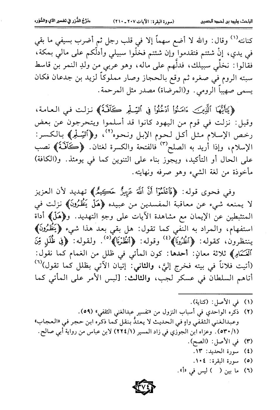{يَا أَيُّهَا الَّذِينَ آمَنُوا ادْخُلُوا فِي السِّلْمِ كَافَّةً} نزلت في العامة، وقيل: نزلت في قوم من اليهود كانوا قد أسلموا ويتحرجون عن بعض رخص الإسلام مثل أكل لحوم الإبل ونحوه (¬2)، و {السِّلْمِ} بالكسر: الإسلام، وإذا أريد به الصلح (¬3) فالفتحة والكسرة لغتان. {كَافَّةً} نصب على الحال أو التأكيد، ويجوز بناء على التنوين كما في يومئذ. و (الكافة) مأخوذة من لغة الشيء وهو صرفه ونهايته.