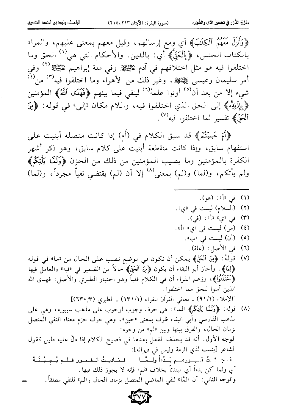 (¬7) قولهُ: {مِنَ الْحَقِّ} يمكن أن تكون في موضع نصب على الحال من "ما" في قوله {لِمَا}. وأجاز أبو البقاء أن يكون {مِنَ الْحَقِّ} حالًا من الضمير في "فيه" والعامل فيها {اخْتَلَفُوا}، وزعم الفراء أن في الكلام قلبًا وهو اختيار الطبري والأصل: فهدى الله الذين آمنوا للحق مما اختلفوا.
