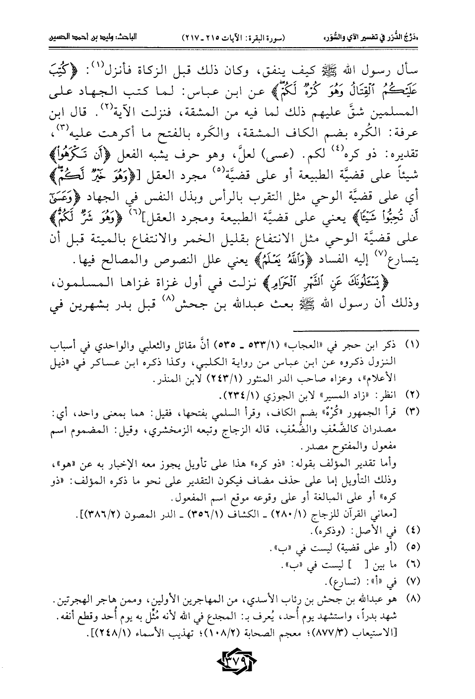 سأل رسول الله - صلى الله عليه وسلم - كيف ينفق، وكان ذلك قبل الزكاة فأنزل (¬1): {كُتِبَ عَلَيْكُمُ الْقِتَالُ وَهُوَ كُرْهٌ لَكُمْ} عن ابن عباس: لما كتب الجهاد على المسلمين شقَّ عليهم ذلك لما فيه من المشقة، فنزلت الآية (¬2). قال ابن عرفة: الكُره بضم الكاف المشقة، والكَره بالفتح ما أكرهت عليه (¬3)، تقديره: ذو كره (¬4) لكم. (عسى) لعلَّ، وهو حرف يشبه الفعل {أَنْ تَكْرَهُوا} شيئًا على قضيَّة الطبيعة أو على قضيَّة (¬5) مجرد العقل [{وَهُوَ خَيْرٌ لَكُمْ} أي على قضيَّة الوحي مثل التقرب بالرأس وبذل النفس في الجهاد {وَعَسَى أَنْ تُحِبُّوا شَيْئًا} يعني على قضيَّة الطبيعة ومجرد العقل] (¬6) {وَهُوَ شَرٌّ لَكُمْ} على قضيَّة الوحي مثل الانتفاع بقليل الخمر والانتفاع بالميتة قبل أن يتسارع (¬7) إليه الفساد {وَاللَّهُ يَعْلَمُ} يعني علل النصوص والمصالح فيها.