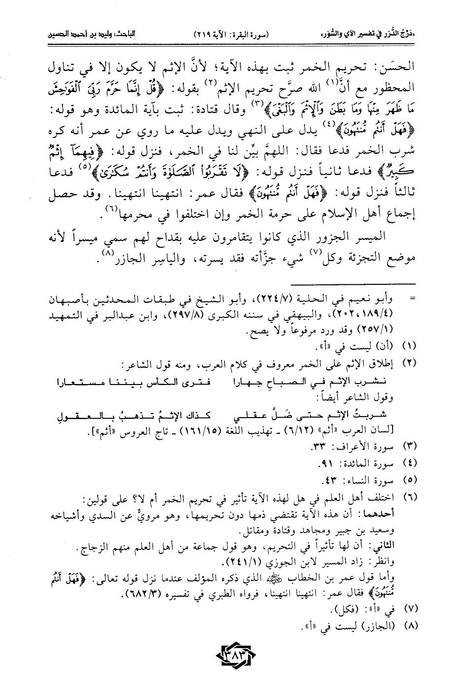 الحسَن: تحريم الخمر ثبت بهذه الآية؛ لأنَّ الإثم لا يكون إلا في تناول المحظور مع أنَّ (¬1) الله صرَّح تحريم الإثم (¬2) بقوله: {قُلْ إِنَّمَا حَرَّمَ رَبِّيَ الْفَوَاحِشَ مَا ظَهَرَ مِنْهَا وَمَا بَطَنَ وَالْإِثْمَ وَالْبَغْيَ} (¬3) وقال قتادة: ثبت بآية المائدة وهو قوله: {فَهَلْ أَنْتُمْ مُنْتَهُونَ} (¬4) يدل على النهي ويدل عليه ما روي عن عمر أنه كره شرب الخمر فدعا فقال: اللهمَّ بيِّن لنا في الخمر، فنزل قوله: {فِيهِمَا إِثْمٌ كَبِيرٌ} فدعا ثانيًا فنزل قوله: {لَا تَقْرَبُوا الصَّلَاةَ وَأَنْتُمْ سُكَارَى} (¬5) فدعا ثالثًا فنزل قوله: {فَهَلْ أَنْتُمْ مُنْتَهُونَ} فقال عمر: انتهينا انتهينا. وقد حصل إجماع أهل الإِسلام على حرمة الخمر وإن اختلفوا في محرمها (¬6).