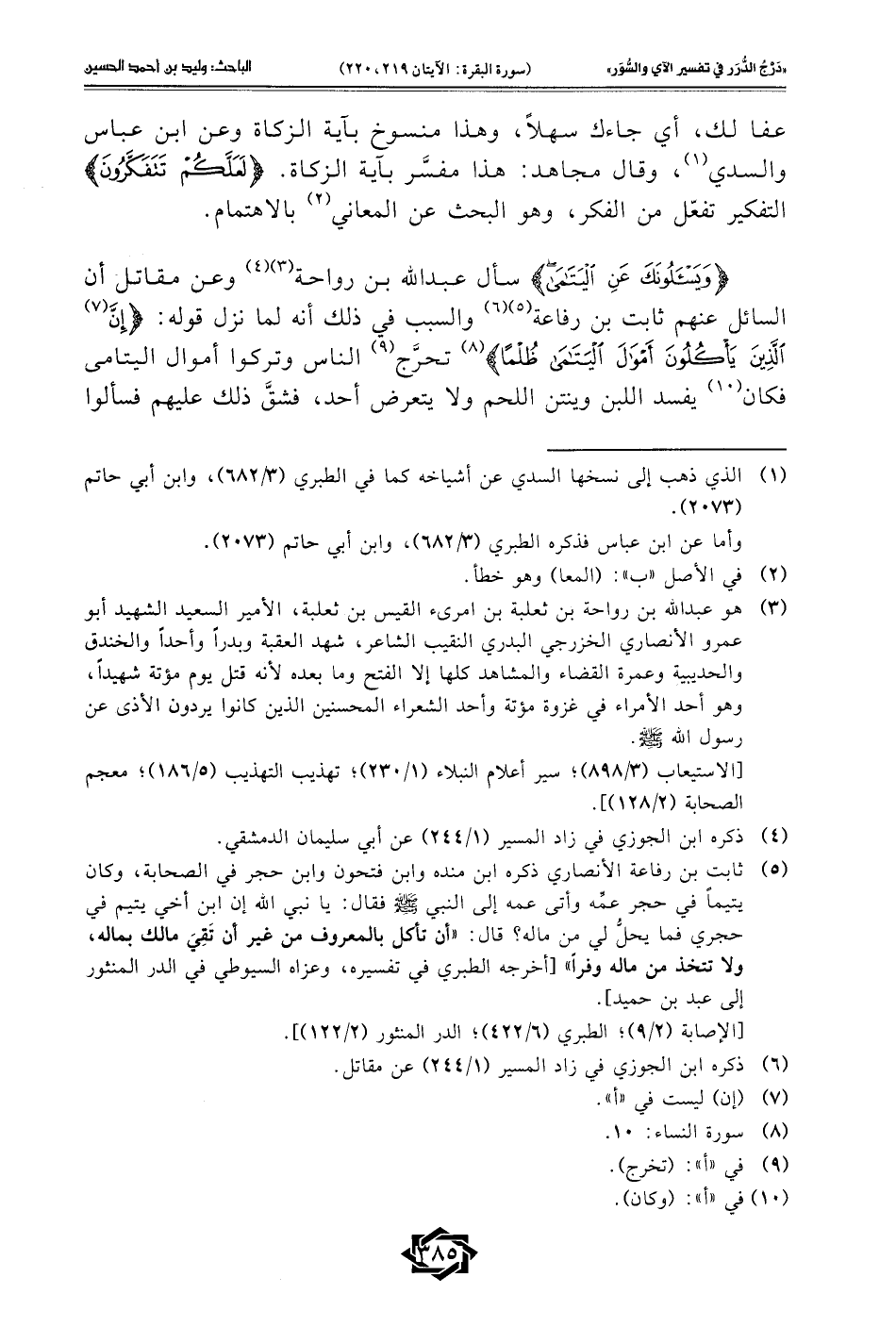 (¬5) ثابت بن رفاعة الأنصاري ذكره ابن منده وابن فتحون وابن حجر في الصحابة، وكان يتيمًا في حجر عمه وأتى عمه إلى النبي - صلى الله عليه وسلم - فقال: يا نبي الله إن ابن أخي يتيم في حجري فما يحلُّ لي من ماله؟ قال: "أن تأكل بالمعروف من غير أن تَقِيَ مالك بماله، ولا تتخذ من ماله وفرًا" [أخرجه الطبري في تفسيره، وعزاه السيوطي في الدر المنثور إلى عبد بن حميد].