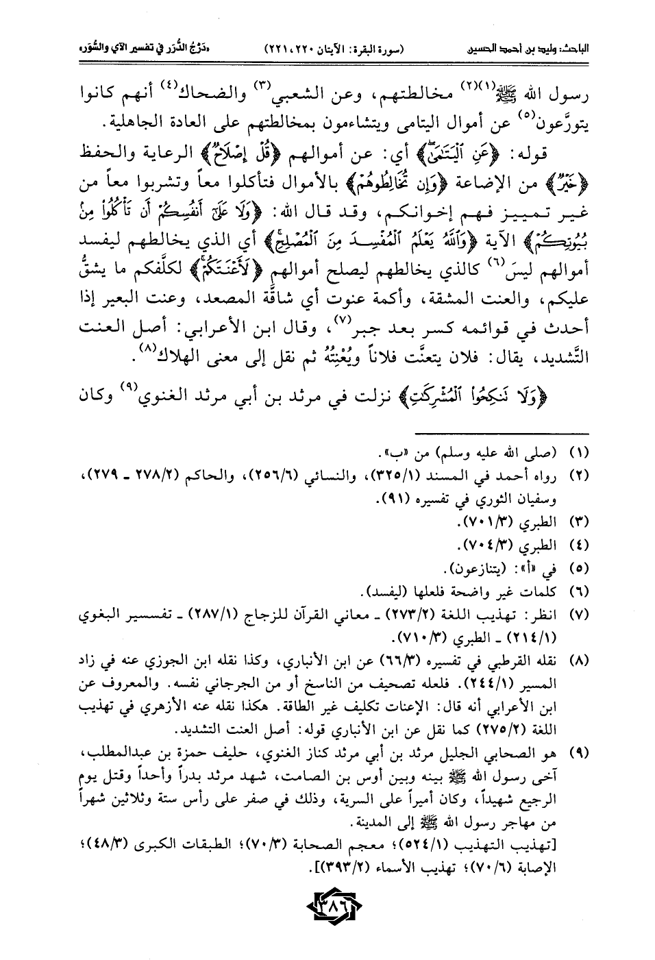 رسول الله - صلى الله عليه وسلم - (¬1) (¬2) مخالطتهم، وعن الشعبي (¬3) والضحاك (¬4) أنهم كانوا يتورَّعون (¬5) عن أموال اليتامى ويتشاءمون بمخالطتهم على العادة الجاهلية.
