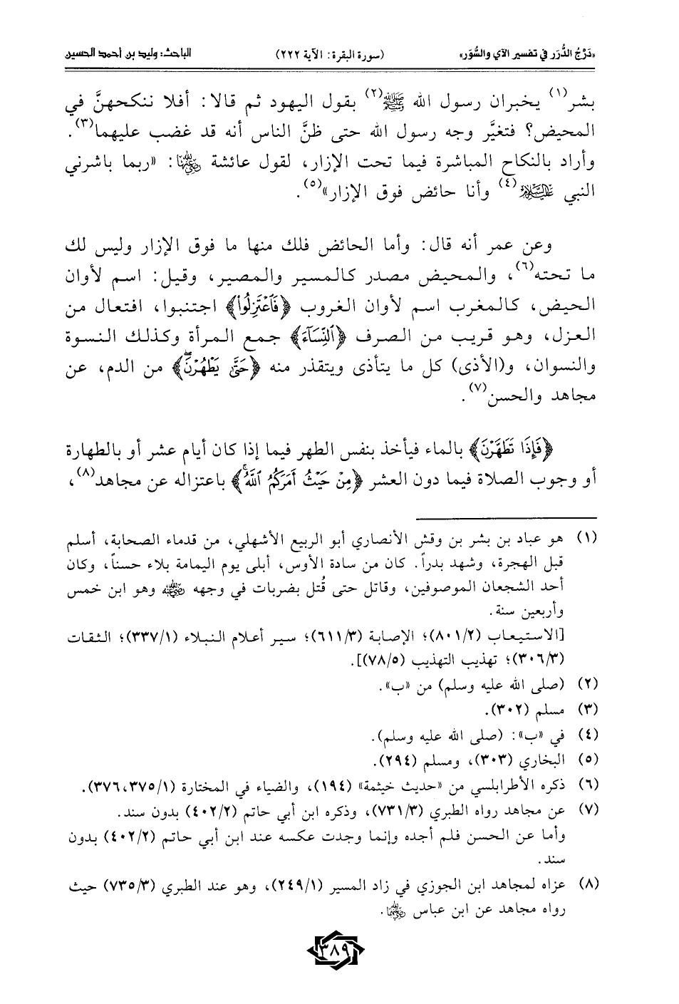 بشر (¬1) يخبران رسول الله - صلى الله عليه وسلم - (¬2) بقول اليهود ثم قالا: أفلا ننكحهنَّ في المحيض؟ فتغيَّر وجه رسول الله حتى ظنَّ الناس أنه قد غضب عليهما (¬3). وأراد بالنكاح المباشرة فيما تحت الإزار، لقول عائشة - رضي الله عنها -: "ربما باشرني النبي عليه السلام (¬4) وأنا حائض فوق الإزار" (¬5).