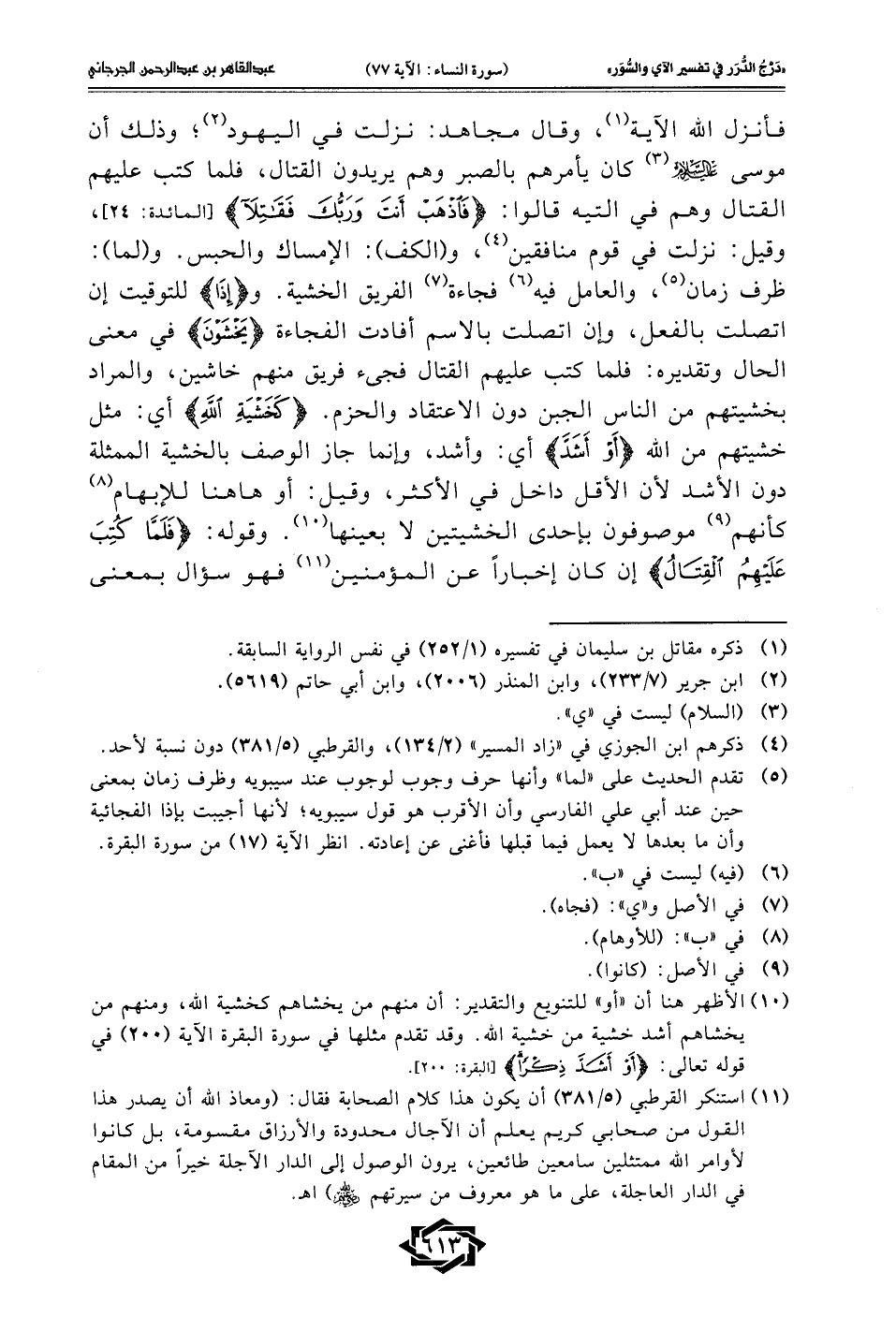 فأنزل الله الآية (¬1)، وقال مجاهد: نزلت في اليهود (¬2)؛ وذلك أن موسى -عليه السلام- (¬3) كان يأمرهم بالصبر وهم يريدون القتال، فلما كتب عليهم القتال وهم في التيه قالوا: {فَاذْهَبْ أَنْتَ وَرَبُّكَ فَقَاتِلَا} [المائدة: 24]، وقيل: نزلت في قوم منافقين (¬4)، و (الكف): الإمساك والحبس. و (لما): ظرف زمان (¬5)، والعامل فيه (¬6) فجاءة (¬7) الفريق الخشية. و {إِذَا} للتوقيت إن اتصلت بالفعل، وإن اتصلت بالاسم أفادت الفجاءة {يَخْشَوْنَ} في معنى الحال وتقديره: فلما كتب عليهم القتال فجىء فريق منهم خاشين، والمراد بخشيتهم من الناس الجبن دون الاعتقاد والحزم. {كَخَشْيَةِ اللَّهِ} أي: مثل خشيتهم من الله {أَوْ أَشَدَّ} أي: وأشد، وإنما جاز الوصف بالخشية الممثلة دون الأشد لأن الأقل داخل في الأكثر، وقيل: أو هاهنا للإبهام (¬8) كأنهم (¬9) موصوفون بإحدى الخشيتين لا بعينها (¬10). وقوله: {فَلَمَّا كُتِبَ عَلَيْهِمُ الْقِتَالُ} إن كان إخبارًا عن المؤمنين (¬11) فهو سؤال بمعنى