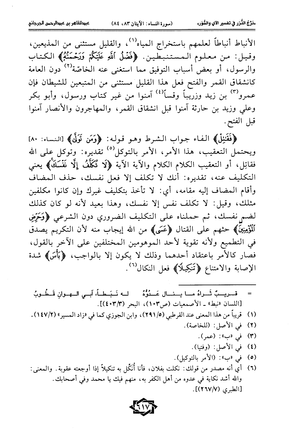 {فَقَاتِلْ} الفاء جواب الشرط وهو قوله: {وَمَنْ تَوَلَّى} [النساء: 80] ويحتمل التعقيب، هذا الأمر، الأمر بالتوكل (¬5) تقديره: وتوكل على الله فقاتِل، أو التعقيب الكلام الكلام والآية الآية {لَا تُكَلَّفُ إِلَّا نَفْسَكَ} يعني التكليف عنه، تقديره: أنك لا تكلف إلا فعل نفسك، حذف المضاف وأقام المضاف إليه مقامه، أي: لا تأخذ بتكليف غيرك وإن كانوا مكلفين مثلك، وقيل: لا تكلف نفس إلا نفسك، وهذا بعيد لأنه لو كان كذلك لضم نفسك، ثم حملناه على التكليف الضروري دون الشرعي {وَحَرِّضِ الْمُؤْمِنِينَ} حثهم على القتال {عَسَى} من الله إيجاب منه لأن التكريم يصدق في التطميع ولأنه تقوية لأحد الموهومين المختلفين على الآخر بالقول، فصار كالأمر باعتقاد أحدهما وذلك لا يكون إلا بالواجب، {بَأْسَ} شدة الإصابة والامتناع {تَنْكِيلًا} فعل النكال (¬6).