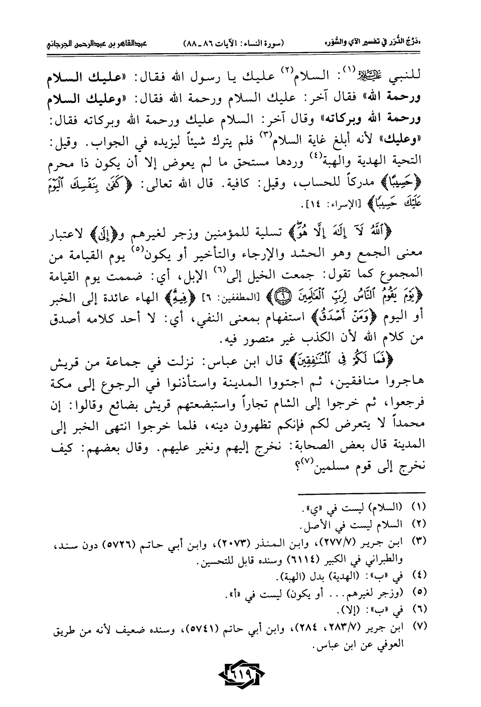 للنبي -عليه السلام- (¬1): السلام (¬2) عليك يا رسول الله فقال: "عليك السلام ورحمة الله " فقال آخر: عليك السلام ورحمة الله فقال: "وعليك السلام ورحمة الله وبركاته" وقال آخر: السلام عليك ورحمة الله وبركاته فقال: "وعليك"؛ لأنه أبلغ غاية السلام (¬3) فلم يترك شيئًا ليزيده في الجواب. وقيل: التحية الهدية والهبة (¬4) وردها مستحق ما لم يعوض إلا أن يكون ذا محرم {حَسِيبًا} مدركًا للحساب، وقيل: كافية. قال الله تعالى: {كَفَى بِنَفْسِكَ الْيَوْمَ عَلَيْكَ حَسِيبًا} [الإسراء: 14].